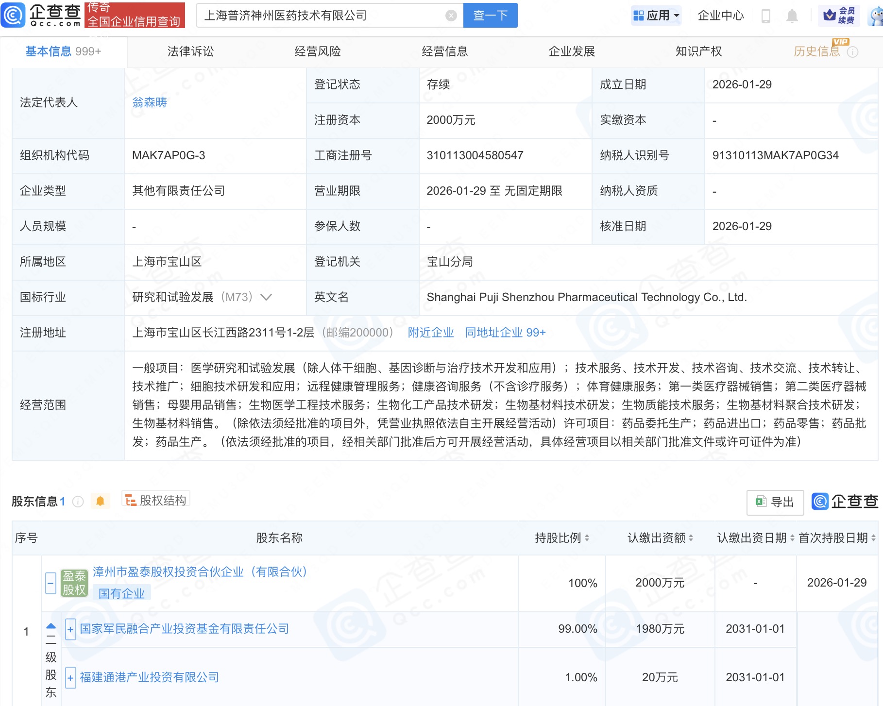 企查查APP显示,近日,上海普济神州医药技术有限公司成立,注册资本2000万元,经营范围包含:医学研究和试验发展(除人体干细胞、基因诊断与治疗技术开发和应用);生物质能技术服务;生物基材料聚合技术研发等。企查查股权穿透显示,该公司由国家军民融合产业投资基金有限责任公司旗下漳州市盈泰股权投资合伙企业(有限合伙)全资持股。