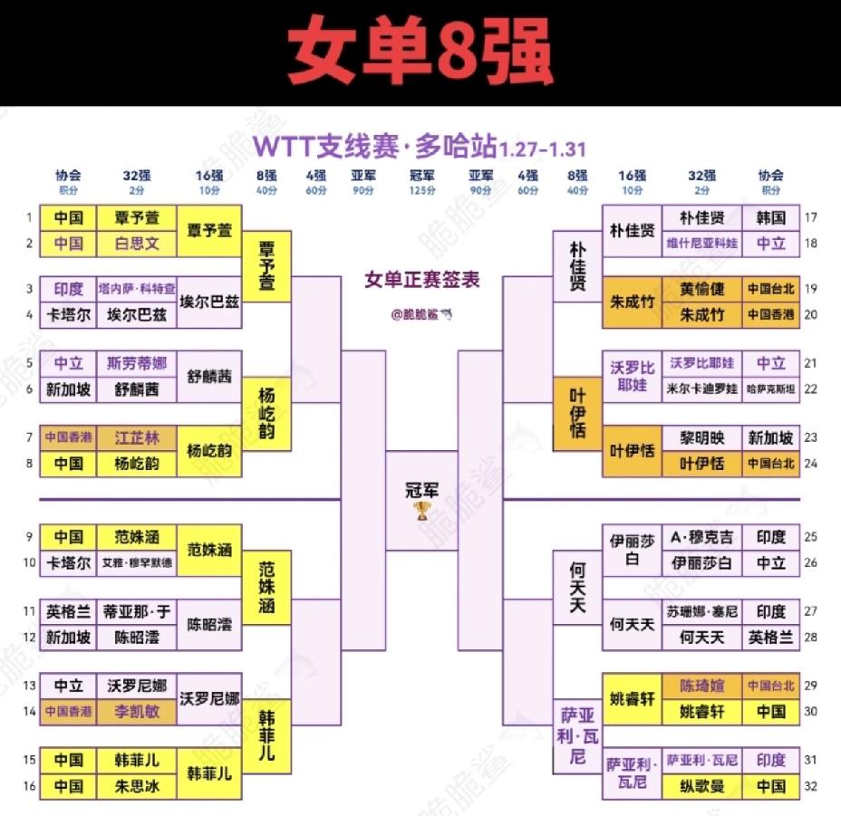 WTT多哈支线赛八强出炉, 女单包揽上半区八强, 提前锁定一个决赛席位。 男单四人晋级八强, 黄友政是一个接着一个的内战。 男单四强国乒三人扎堆上半区, 下半区只有一个陈俊崧守。 黄友政真是一路内战, 打完徐海东打袁励岑。 男单内战, 男双还是内战, 一路内战。[捂脸][捂脸] 女单国乒包揽了上半区, 确实有点“残忍”, 分到下半区两个多好, 还能有望会师决赛。 不过至少有一个能进入决赛, 也是很不错的。 国乒小将们加油, 希望你们多拿几个冠军回来。 (图片源自于水印) 带定位晒今日生活 我的今日状态:😁轻松愉快 我这里的天气:☁️阴天