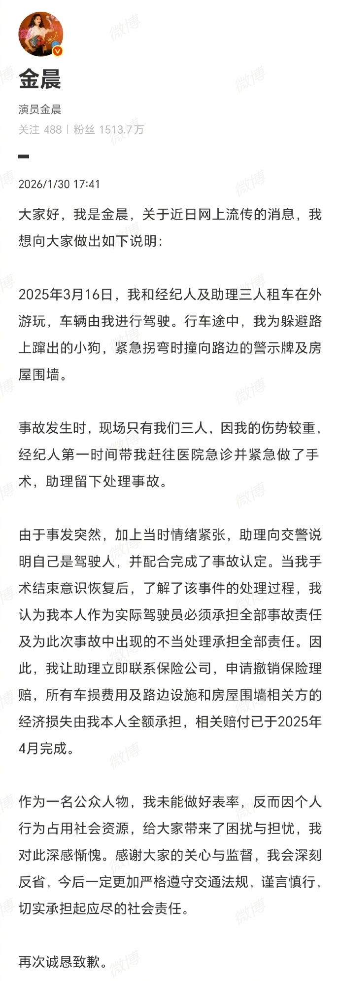 金晨事件印证真诚才是必杀技 公众人物的言行从来都备受关注,意外突发、慌乱失序也难免让人慌乱,但金晨没有退缩,不回避责任、不逃避过错,把该扛的都扛下,用实际行动修正错误,真诚比完美更动人。