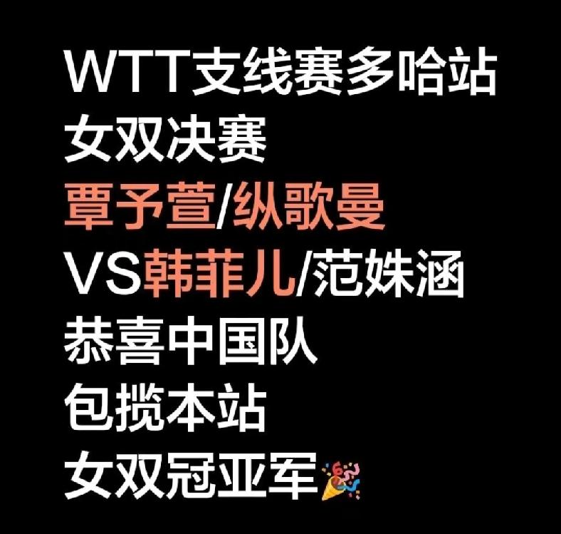 WTT多哈支线赛传来好消息, 国乒男队包揽了冠亚军, 国乒女队包揽了冠亚军。 虽然是小比赛, 但是也是他们一拍一拍打出来的。 恭喜国乒, WTT支线赛多哈站, 国乒包揽了男双、女双冠亚军。 男双决赛黄友政/温瑞博, 对战徐瑛彬/袁励岑。 女双覃予萱/纵歌曼, 对战韩菲儿/范姝涵。 教练组终于可以喘口气了, 最起码双打有两个冠军、两个亚军了, 不妄他们快流浪地球一个月了。 尤其是男队, 黄友政/温瑞博, 继多哈球星挑战赛第二次进入男双决赛。 多哈球星挑战赛不敌韩国组合获得亚军, 这次一定要加油, 争取来个冠军, 以弥补之前的遗憾。 (图片源自于网络)