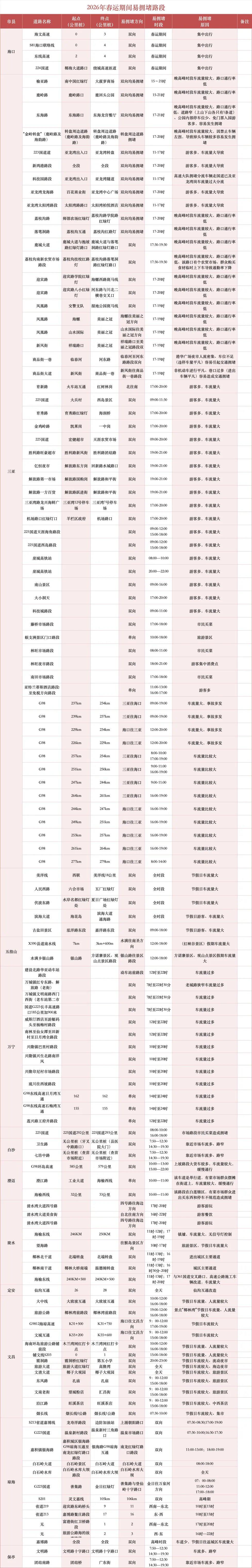 2026年春运自2月2日开始,3月13日结束,共40天。为营造良好的交通环境,海南交警发布春运“两公布一提示”,提醒广大交通参与者合理选择出行时间、线路和方式,避开高峰时段和拥堵路段,谨慎驾驶,安全出行。