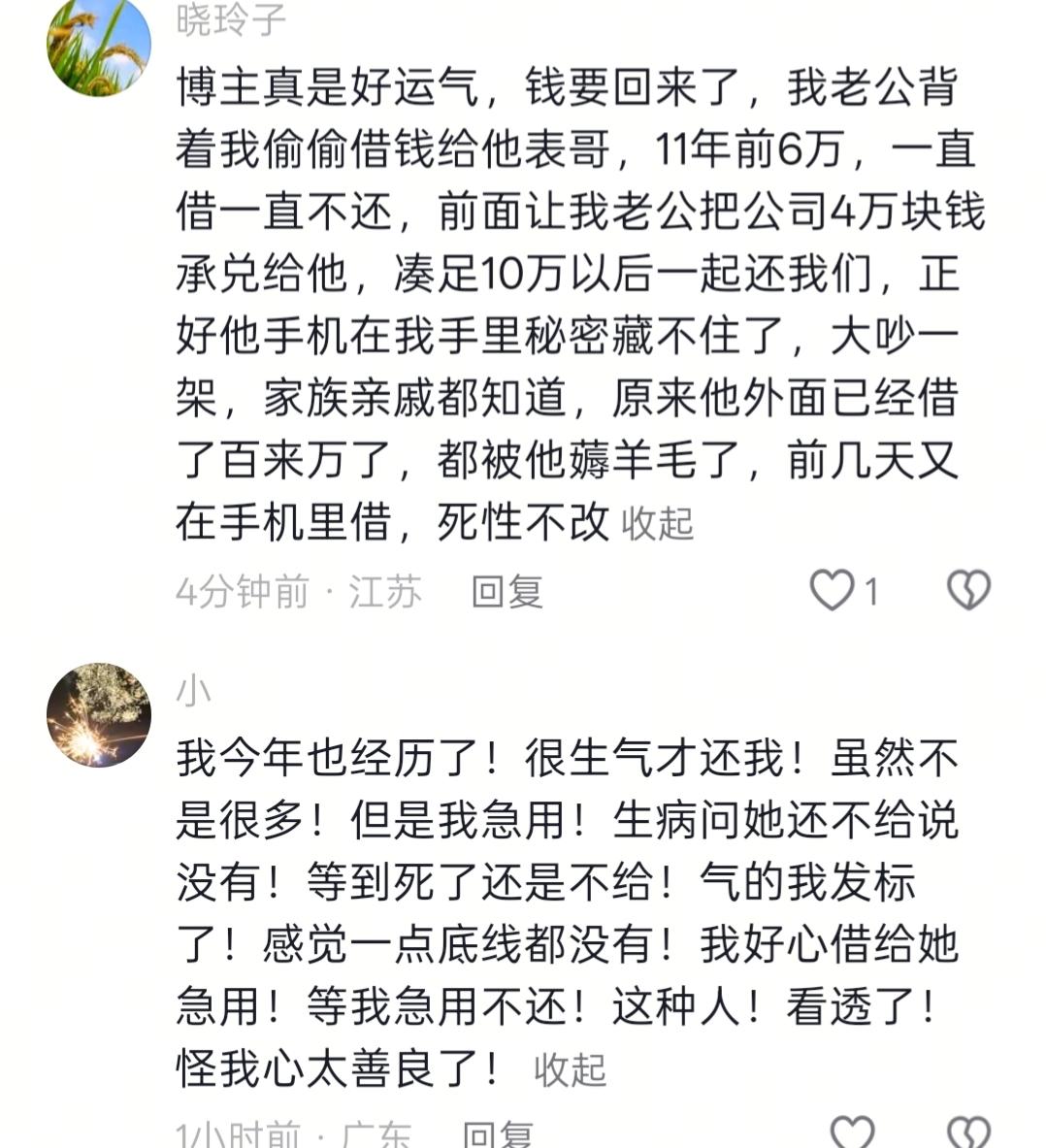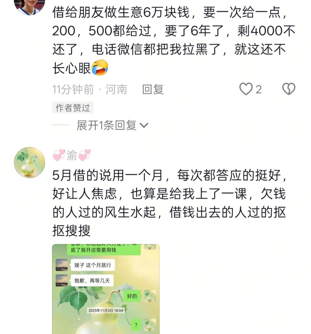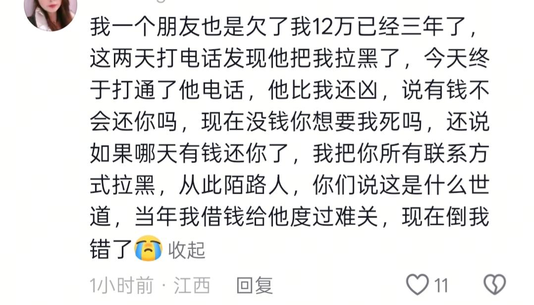 现在借钱的人都这么没底线的吗?一个网友分享的自己借出去2w给朋友救急用,等她发信息要钱时,被这个朋友恶语相向,钱还回来后,还被拉黑。 我也遇到过这种事,一个朋友借了我2千,2年了,找她要的时候,她居然说这点钱还要,我难道不会还给你吗?说完发了2200过来。我也不客气。都收了,反正朋友也做不了了。 所以,借钱是最考验人品的,你帮助了别人,他( 她)可能还怨上你了!