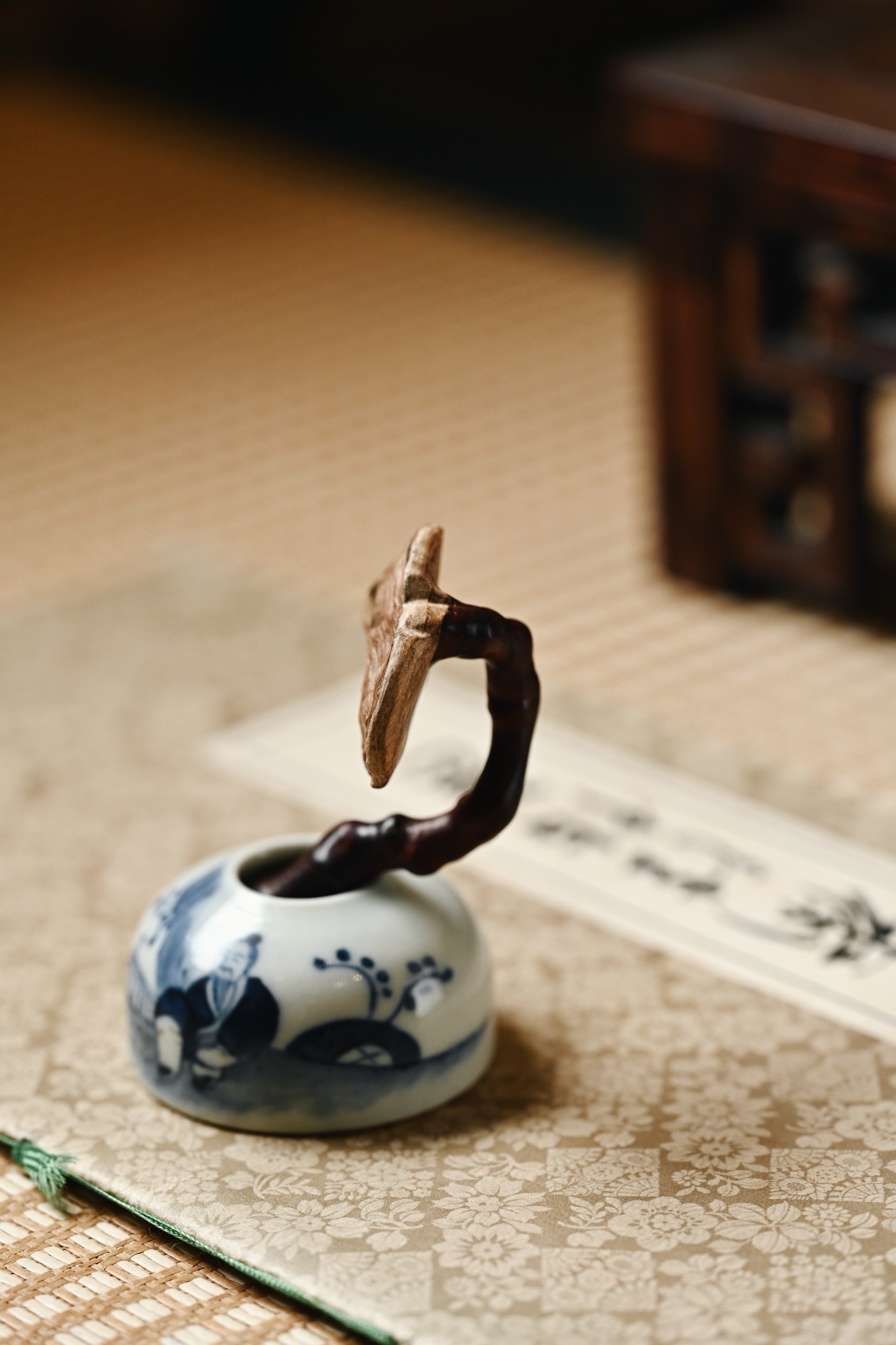 巧妙保留木皮进行巧雕,雕作灵芝之形,天然纹理卷曲如云,握于掌中,尽显中式文玩的雅趣。
