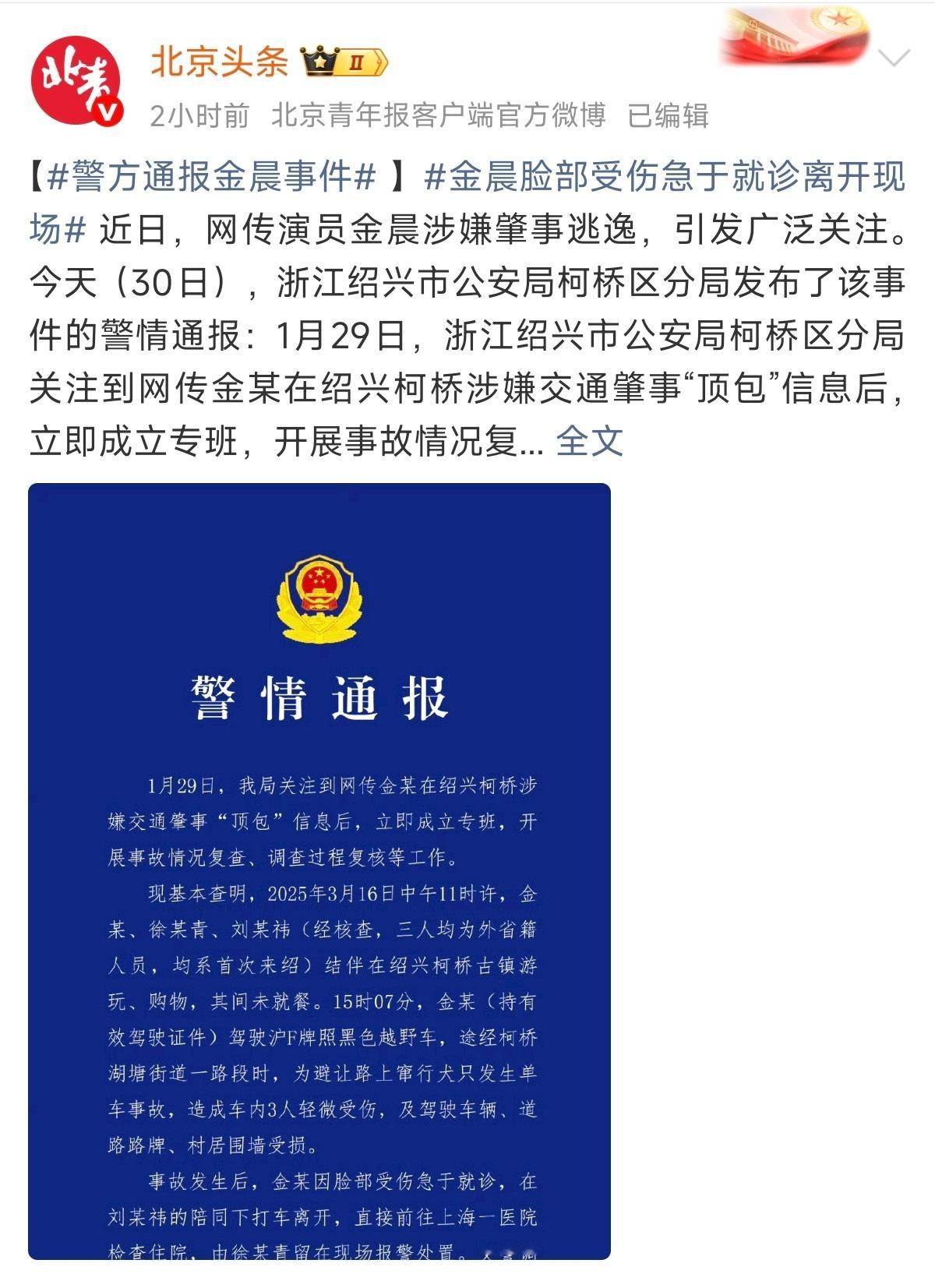 刚刚,金晨涉嫌肇事逃逸官方权威通报来了。根据官方通报,金晨是在这起事故中受伤了