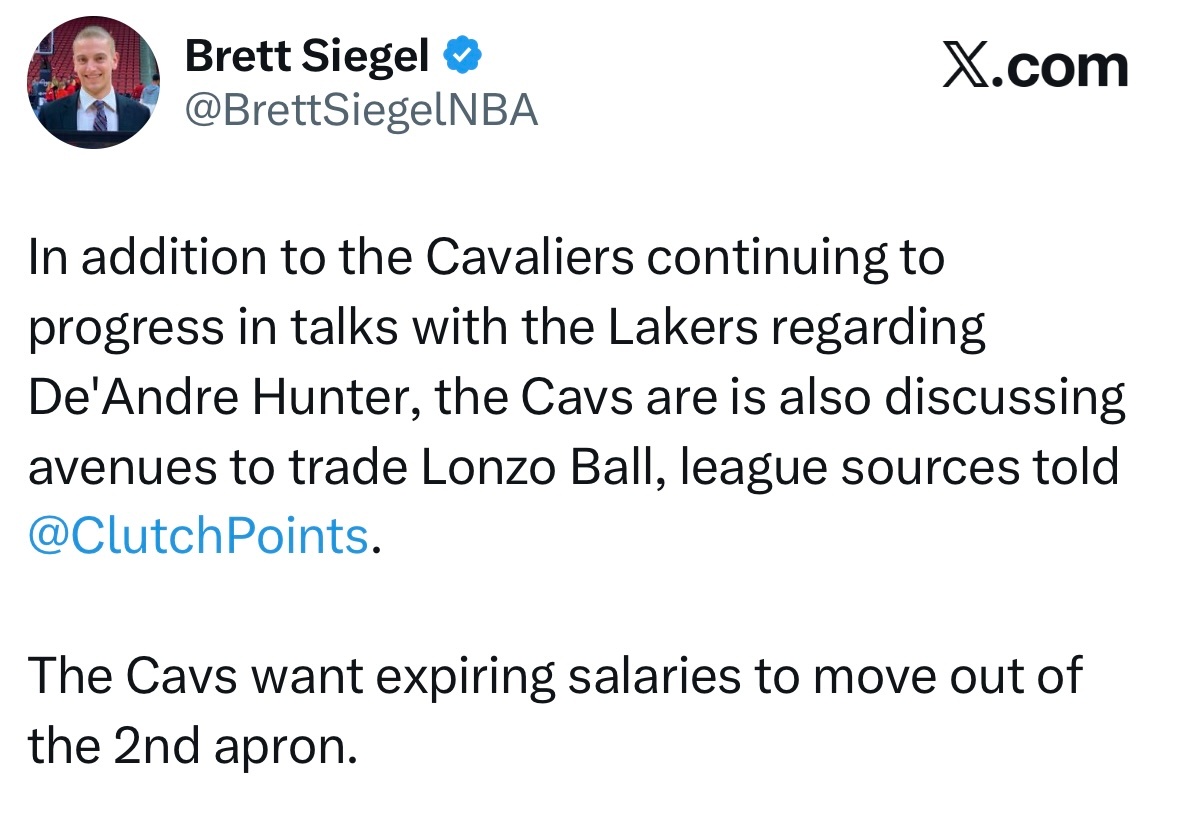 骑士队除了持续推进与湖人队关于亨特的交易谈判外,同时也在探讨交易老将后卫朗佐-鲍尔的可行方案。