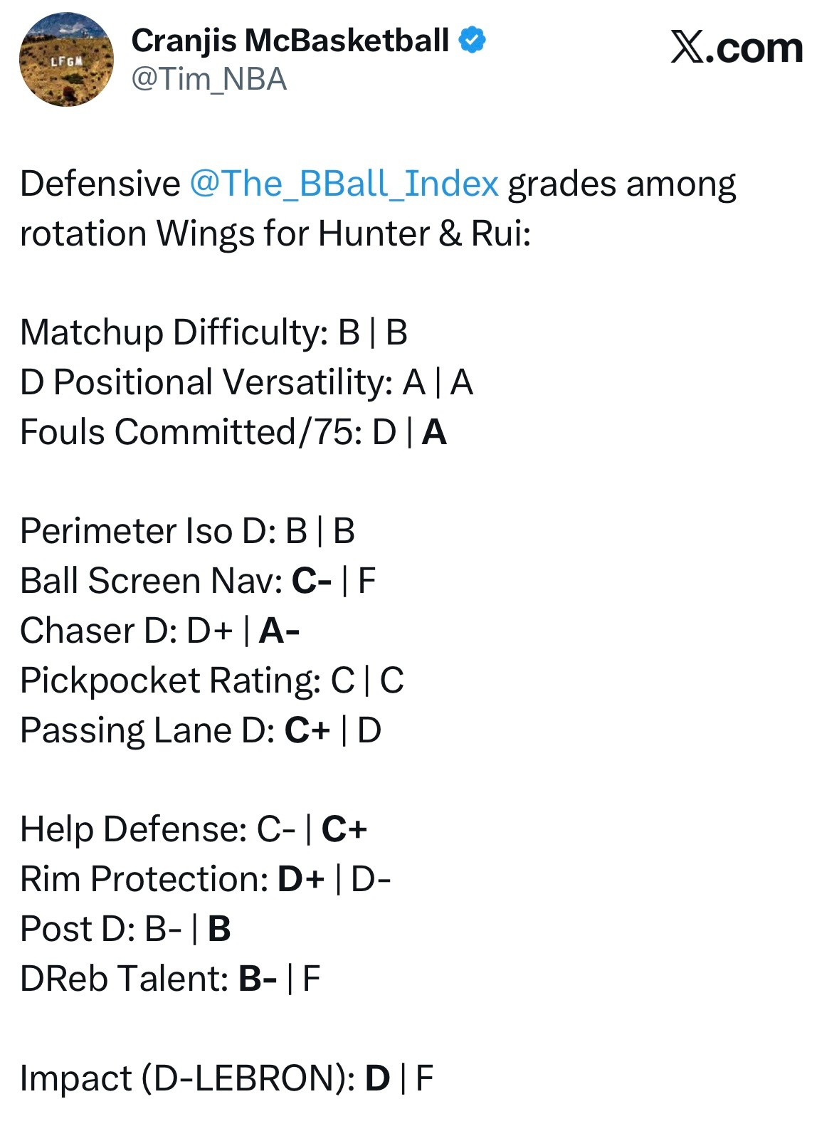 亨特与八村塁 防守评级对比:1. 对位难度适配:亨特B|八村塁B2. 防守位置适配性:亨特A|八村塁A3. 每75回合犯规数:亨特D|八村塁A4. 外线单防能力:亨特B|八村塁B5. 挡拆防守表现:亨特C-|八村塁F6. 追防无球射手:亨特D+|八村塁A-7. 抢断预判评级:亨特C|八村塁C8. 传球路线封堵:亨特C+|八村塁D9. 协防意识:亨特C-|八村塁C+10.护筐能力:亨特D+|八村塁D-11.低位防守:亨特B-|八村塁B12.防守篮板天赋:亨特B-|八村塁F13.防守综合影响力(防守胜利贡献值):亨特D|八村塁F