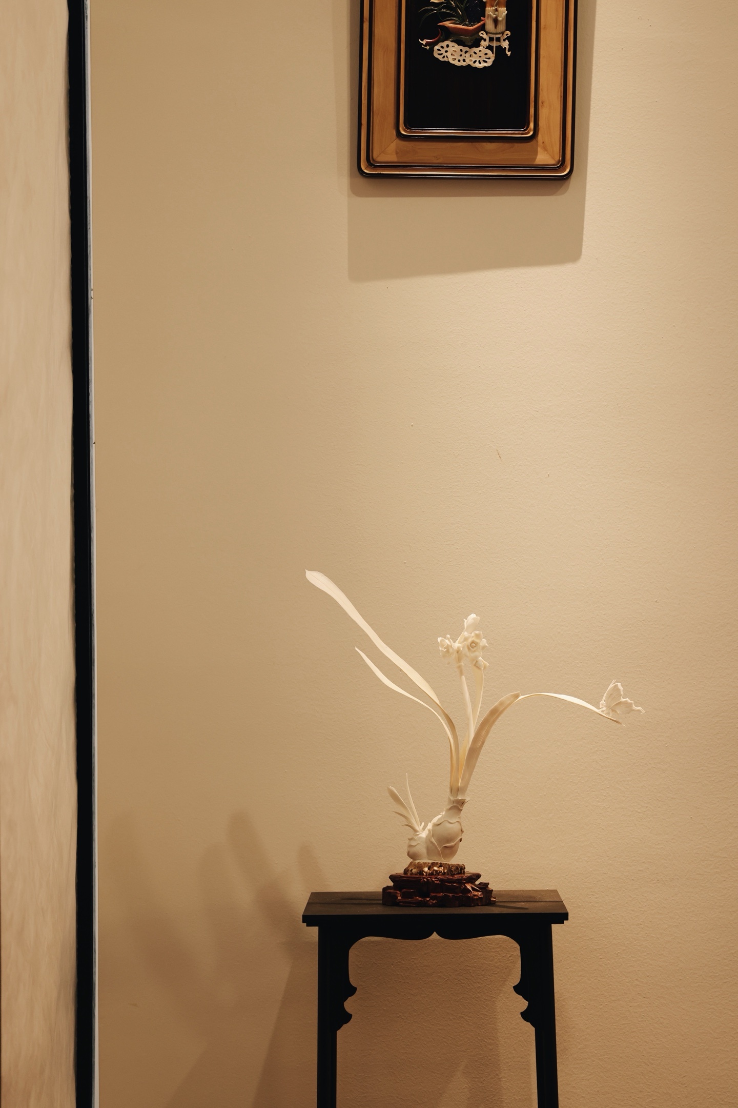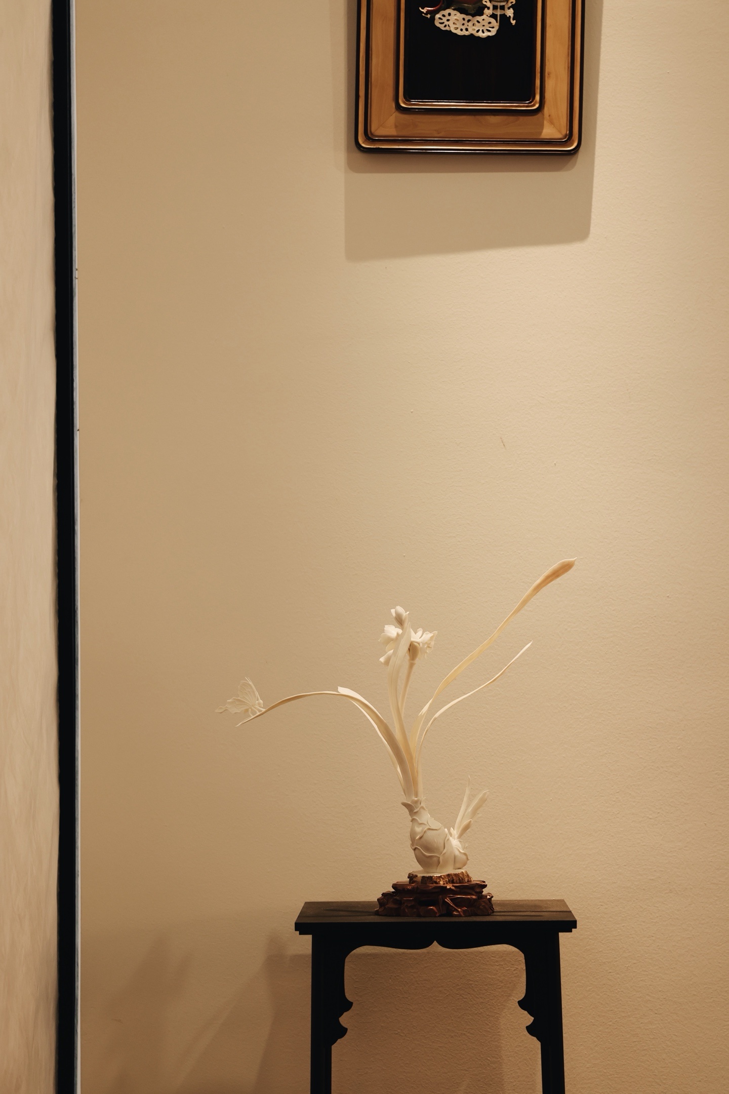 雕工简约又不落优雅之态。花叶倾侧,若临风而动,气韵清灵秀逸。案几陈置,风雅脱俗。