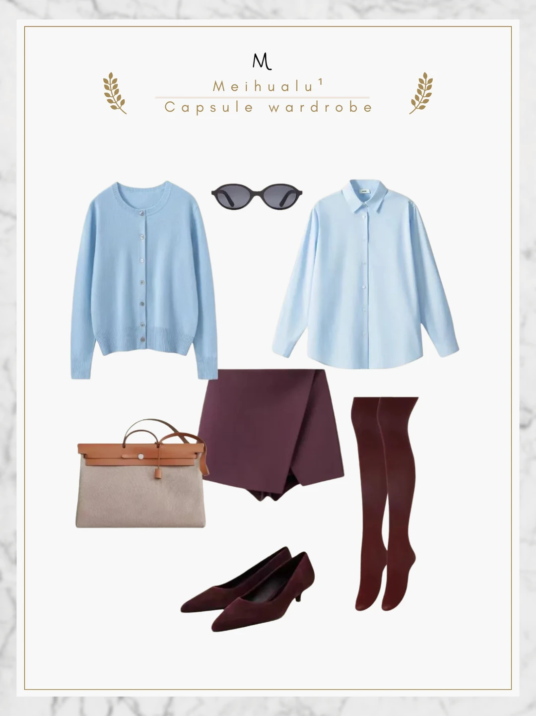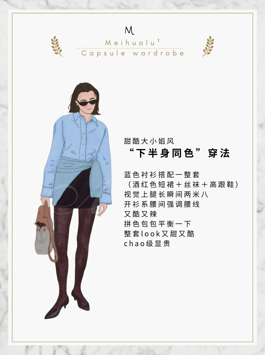 蓝色衬衫搭配一整套酒红色(短裙+丝袜+高跟鞋),视觉上腿长瞬间两米八!