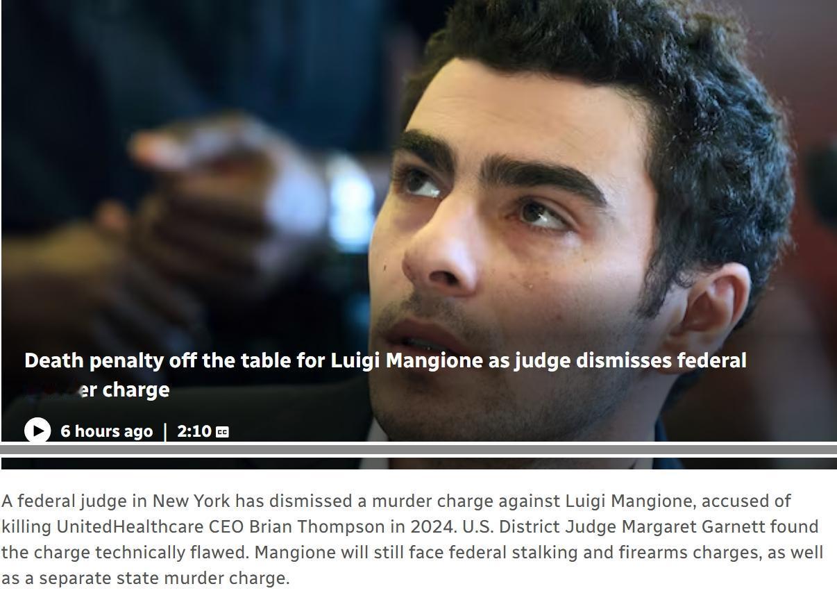 美国法官裁定:检察官不得对路易吉·曼吉奥内寻求死刑 当地时间周五,美国地方法官玛格丽特·加内特驳回了对曼吉奥内的联邦谋杀指控,认为其技术上存在缺陷。因此联邦检察官不能对路易吉·曼吉奥内在联合医疗首席执行官布莱恩·汤普森被杀案中寻求死刑。 玛格丽特·加内特在裁决中写道,她这样做是为了“排除死刑作为陪审团可考虑的惩罚手段的可能性”,因为陪审团正在审议是否对曼乔内进行定罪。 加内特还撤销了一项枪支指控,但仍然保留了跟踪指控,最高刑罚可判处终身监禁。 27岁的曼吉奥内在加内特作出书面裁决约一小时后,与律师们一起参加了一场简短且原定的听证会时显得很放松。检察官保留了对该决定上诉的权利,但表示他们已准备好进入审判程序。 曼吉奥内的律师在听证会上未对此决定作出回应。但他的律师凯伦·弗里德曼·阿格尼菲洛事后表示,她的当事人和辩护团队对这一“令人难以置信的判决”感到宽慰。