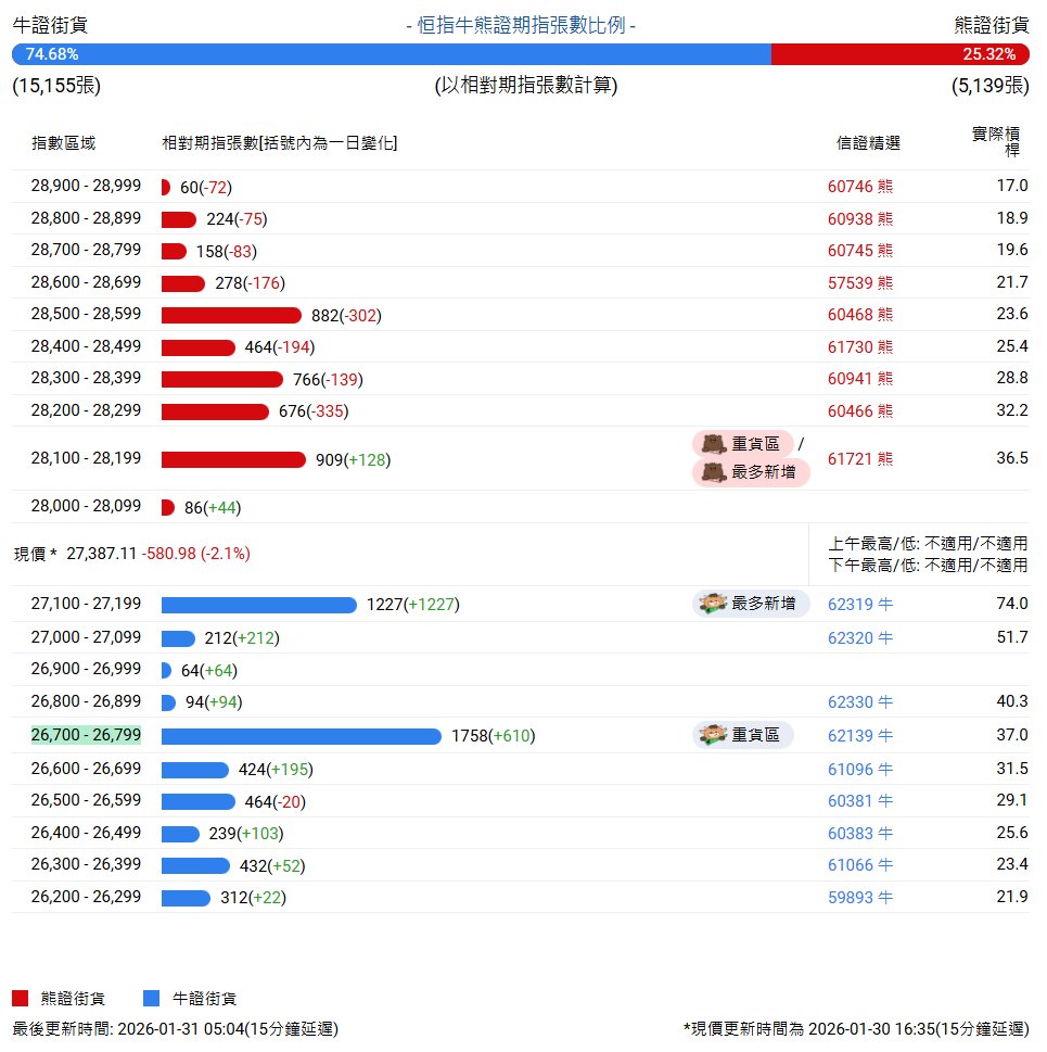 牛证街货重货区在26700-26799区间,该区间最新牛证数量为1758张,较上一交易日增加610张,牛证街货最多新增在27100-27199区间,该区间最新牛证数量为1227张,较上一交易日增加1227张。