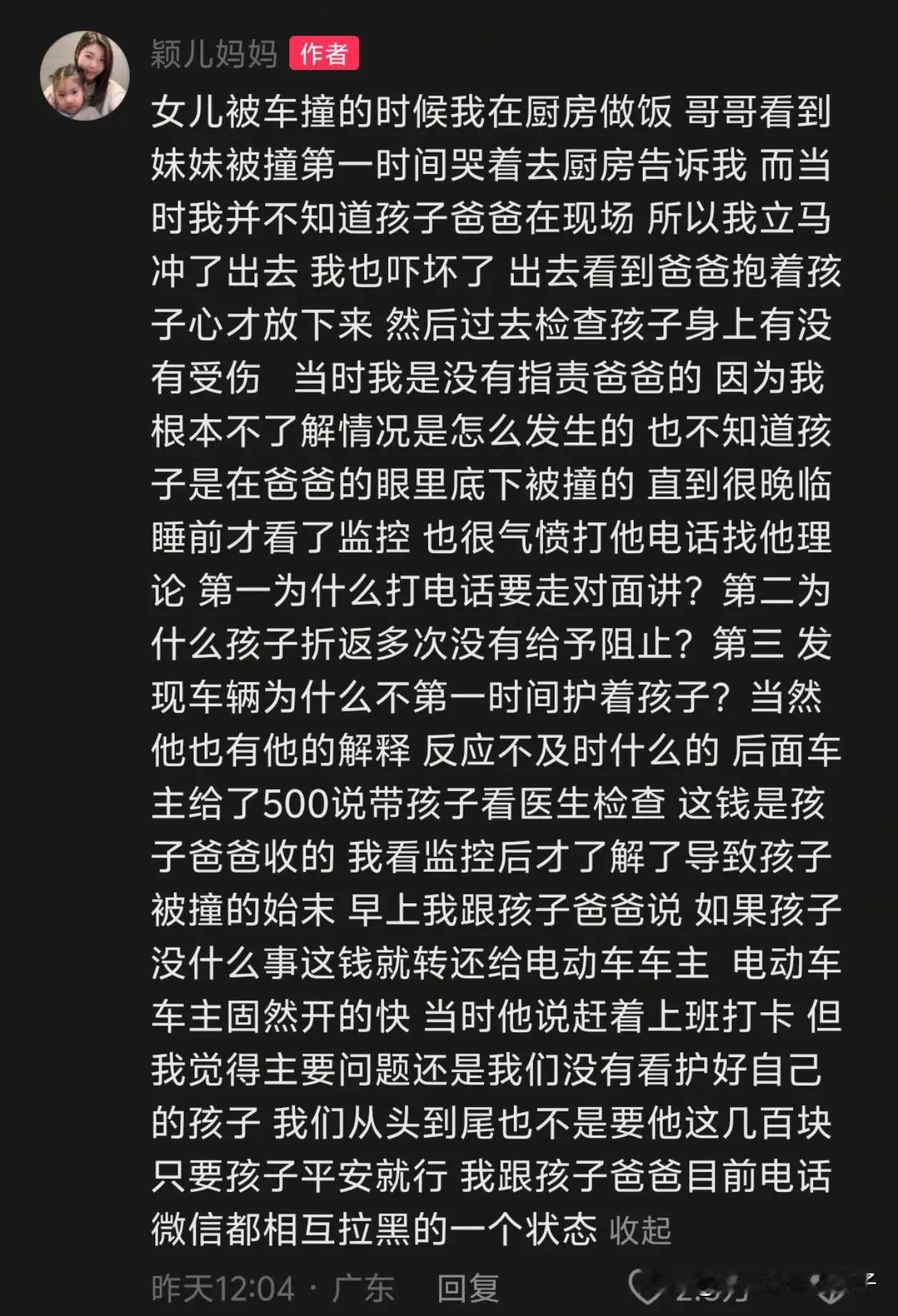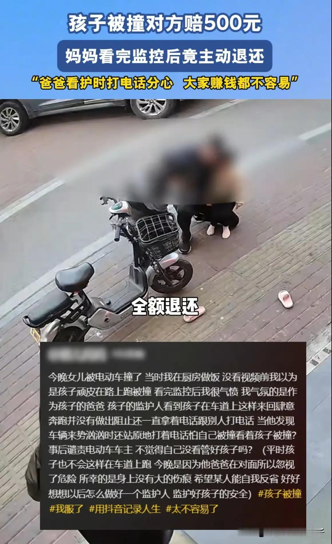 家庭监护危机引发全民热议:父亲边打电话边看孩子,女儿被撞伤后母亲退还500元赔偿,网友:家长责任不能忽视! (来源:红星新闻) 近日,一段令人震惊的视频在网络上引发热议。一名广东的妈妈在朋友圈晒出家门口的监控录像,画面中一名父亲一边打电话,一边看着在路上奔跑的孩子,结果女儿不幸被一辆电动车撞倒。事件发生后,父亲情绪激动,怒吼骑行者“干嘛骑得那么快!”,而骑车者随后赔偿了500元,孩子被送往医院检查。 然而,事情的真相远比表面复杂。当天,母亲在厨房忙碌,未能第一时间察觉女儿的危险。直到晚上,她仔细查看监控录像后才发现,女儿是在父亲的“看护盲区”内被撞的。愤怒的母亲立即让丈夫退还了骑车者赔偿的500元,并将监控视频公开,希望引起社会对家庭监护责任的重视。 这段视频一经曝光,立刻引发网友的热烈讨论。有人为母亲的理性和担当点赞,认为她没有盲目指责骑车者,而是反思家庭责任,强调父母在孩子安全方面的责任不可推卸。有网友留言:“作为家长,最重要的是守护好孩子的安全,不能只靠事后赔偿,更要事前防范。”也有人表示:“父母的疏忽让孩子受伤,责任在家长,不应推卸。” 事件的核心在于家庭监护责任的落实。母亲在接受采访时坦言:“虽然电动车骑得快,但主要责任还是在我们家长没有看好孩子。作为父母,我们要时刻关注孩子的安全,不能让他们在危险的边缘徘徊。”她还强调,自己将视频公开,是希望引起更多家长的反思,学习如何成为一名合格的监护人。 令人惋惜的是,事件也引发了家庭内部的矛盾。母亲透露,事发后,她和丈夫因为对责任的看法不同,电话和微信都互相拉黑了。她说:“我们都在为生活努力,但这次的事情让我意识到,家庭的安全感需要每个家长共同承担。”她希望公众能理解,家庭责任不仅仅是赔偿那么简单,更关乎孩子的成长环境和安全保障。 此事件在网络上引起了广泛关注。许多网友纷纷表示,家长应当时刻警醒,不能让孩子在危险的环境中自由奔跑。有人写道:“孩子的安全是第一位的,父母要用心看护,不能放任他们在危险边缘。”也有人提出建议:“家庭教育要加强安全意识,让孩子懂得自我保护,同时家长也要做好监护责任。” 这起事件也折射出社会对家庭教育和责任的关注。专家指出,家庭是孩子的第一所学校,父母是孩子的第一任老师。家庭的安全环境直接影响孩子的成长。父母应当树立安全第一的理念,合理安排孩子的活动范围,避免危险发生。 此外,此事也提醒我们,法律层面对家庭监护责任的重视。根据相关法律规定,父母有义务对未成年子女进行合理监护,确保他们的安全。一旦因监护不力导致孩子受伤,父母可能承担相应的法律责任。因此,家庭教育不仅仅是情感责任,更是法律责任。 事件的最后,母亲表示,她会继续关注孩子的成长,也希望通过自己的行动,唤起更多家长的责任感。她说:“每个孩子都是家庭的宝贝,作为父母,我们要用心守护,不能让悲剧再次发生。”她还呼吁社会共同关注儿童安全,为孩子营造一个安全、温暖的成长环境。 这起事件虽然看似普通,却折射出家庭教育中不可忽视的问题。家庭责任的落实关系到每个孩子的生命安全,也关系到社会的和谐稳定。希望每一位家长都能以此为戒,强化责任意识,成为孩子最坚实的后盾。 网友们的热议和社会的关注,正是推动家庭教育不断向前的重要力量。只有每个家庭都能成为孩子的坚强保护伞,社会才能更加和谐安定。让我们共同努力,守护每一个天真的笑脸,让孩子们在安全的环境中快乐成长! 家庭监护责任的落实不仅关乎孩子的安全,更是每个父母不可推卸的责任。此次事件引发的关注提醒我们:作为父母,要时刻警醒,增强安全意识,不能让孩子在危险中徘徊。只有家庭责任落实到位,孩子的未来才能更加美好。让我们共同努力,为孩子营造一个安全、温暖的成长环境!家长责任 家长痛心时刻