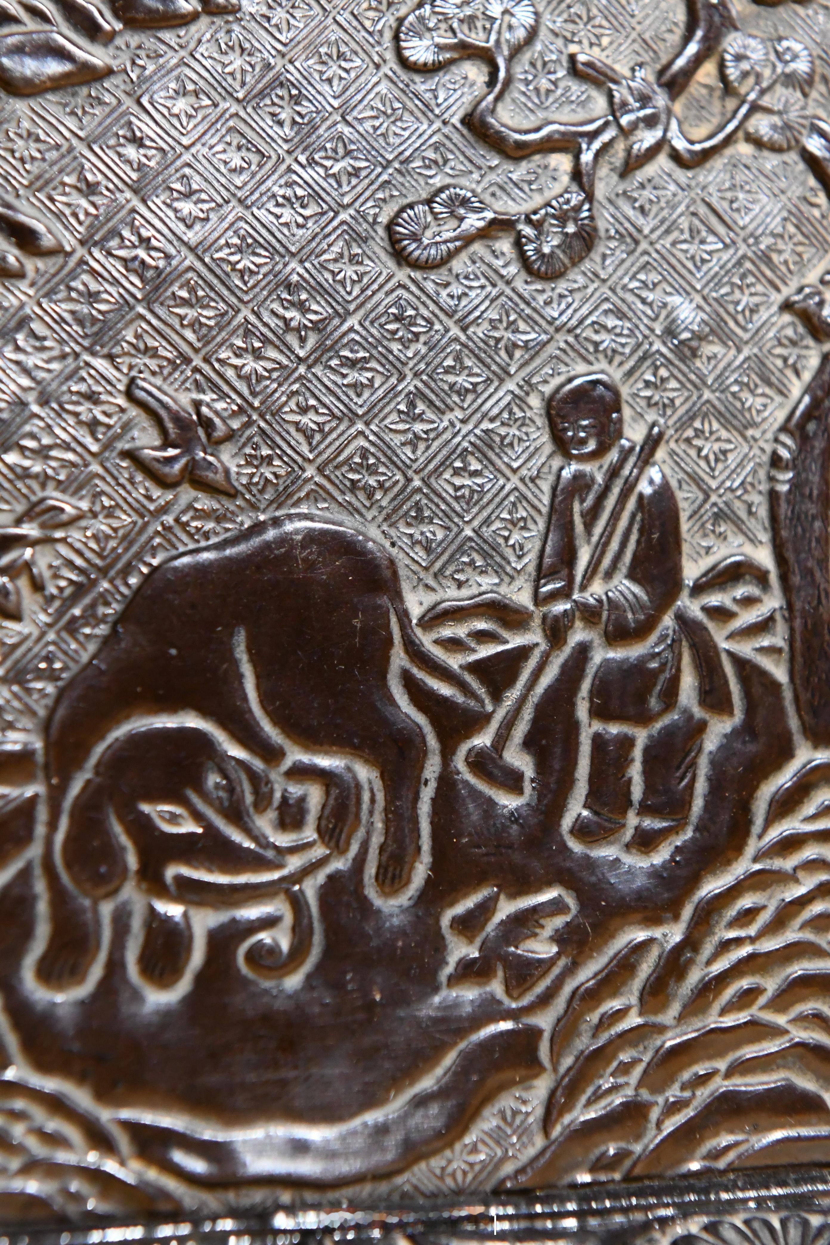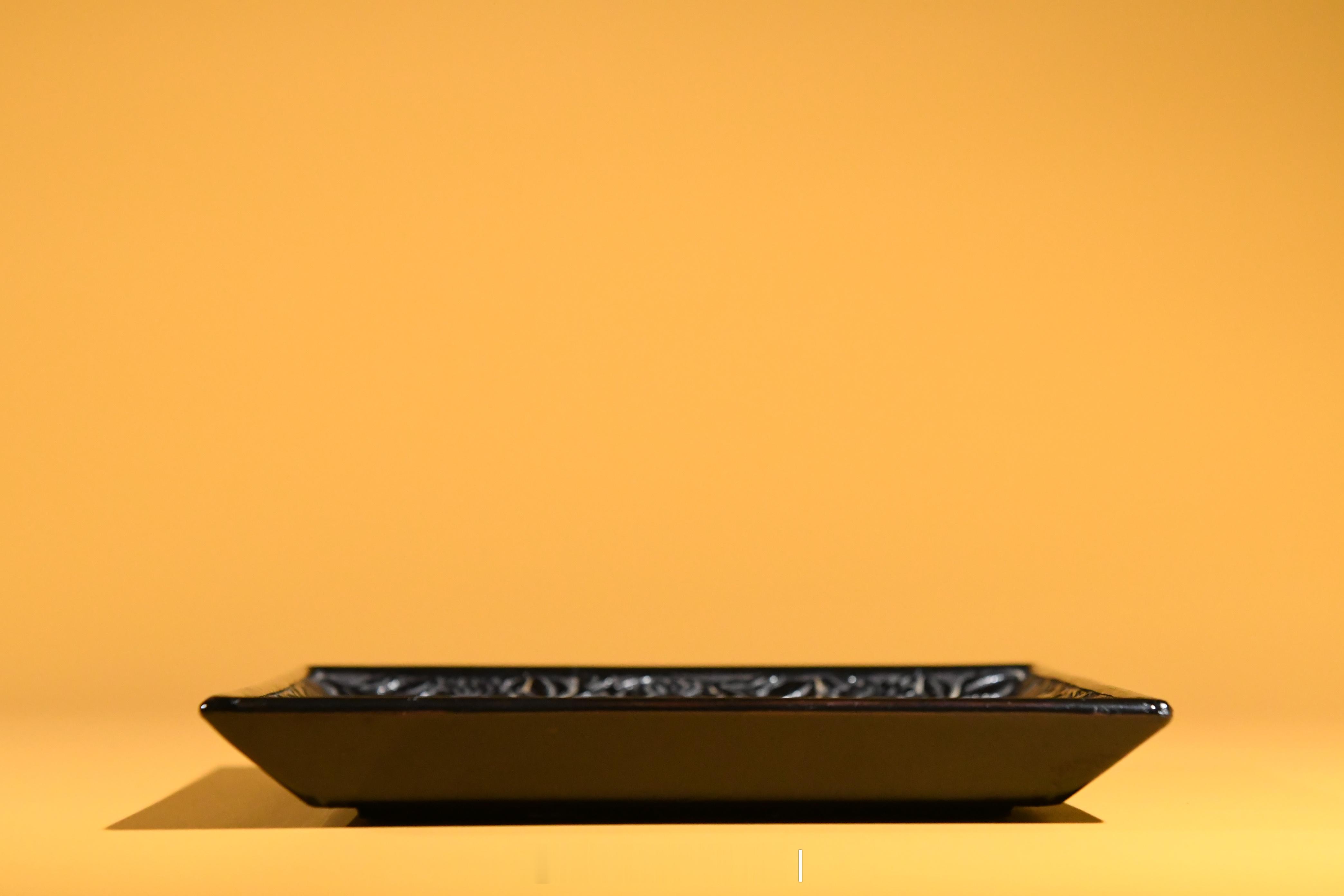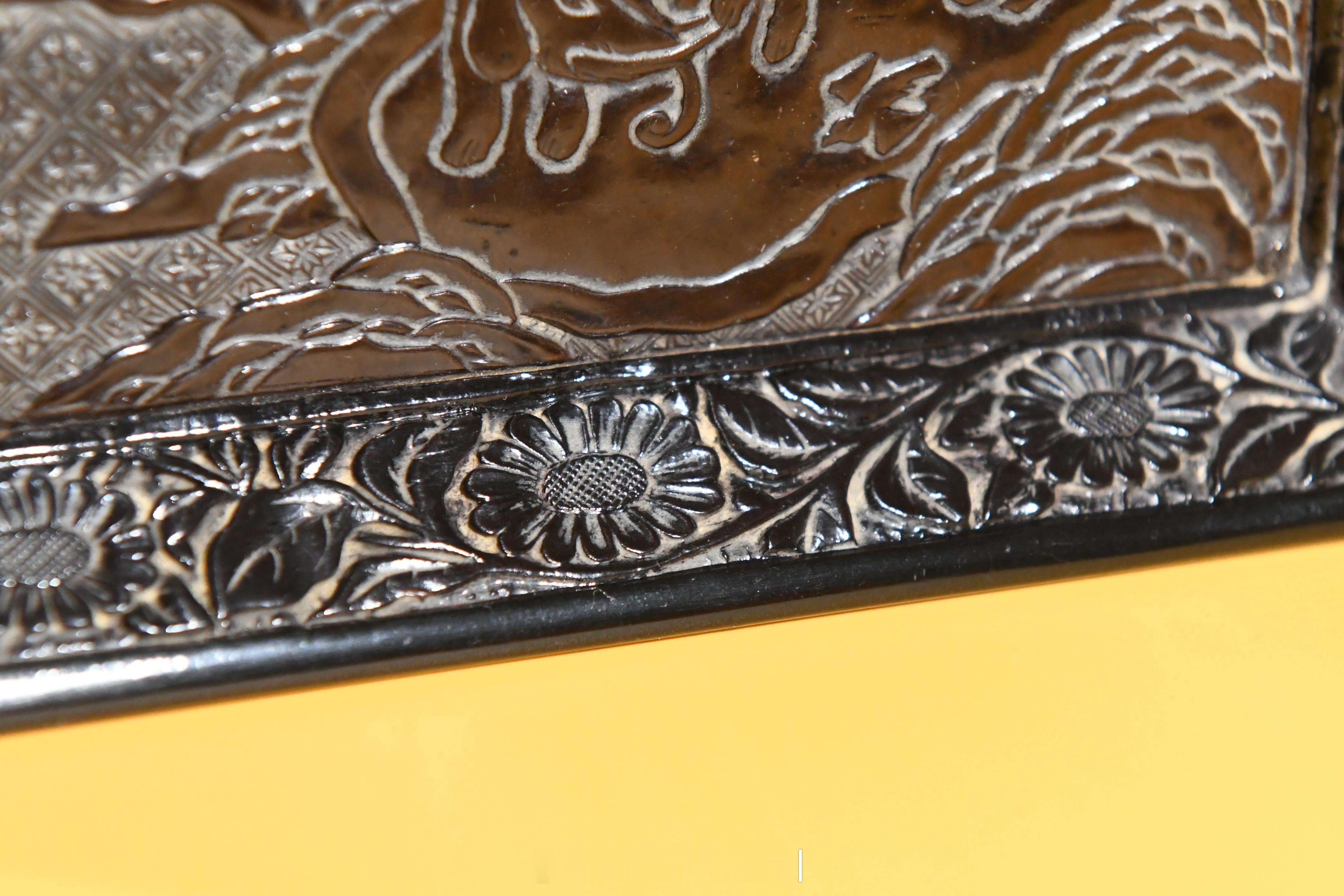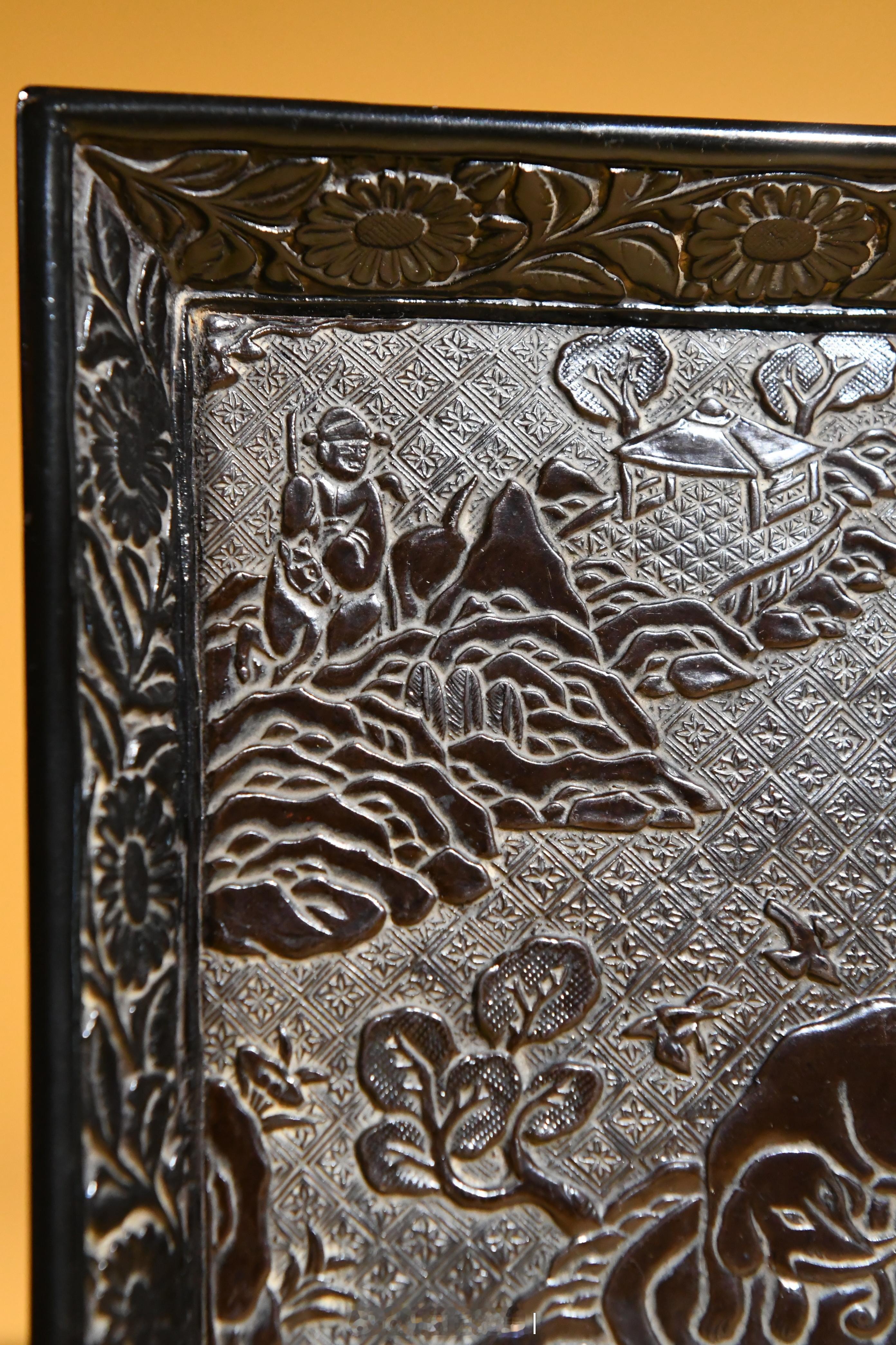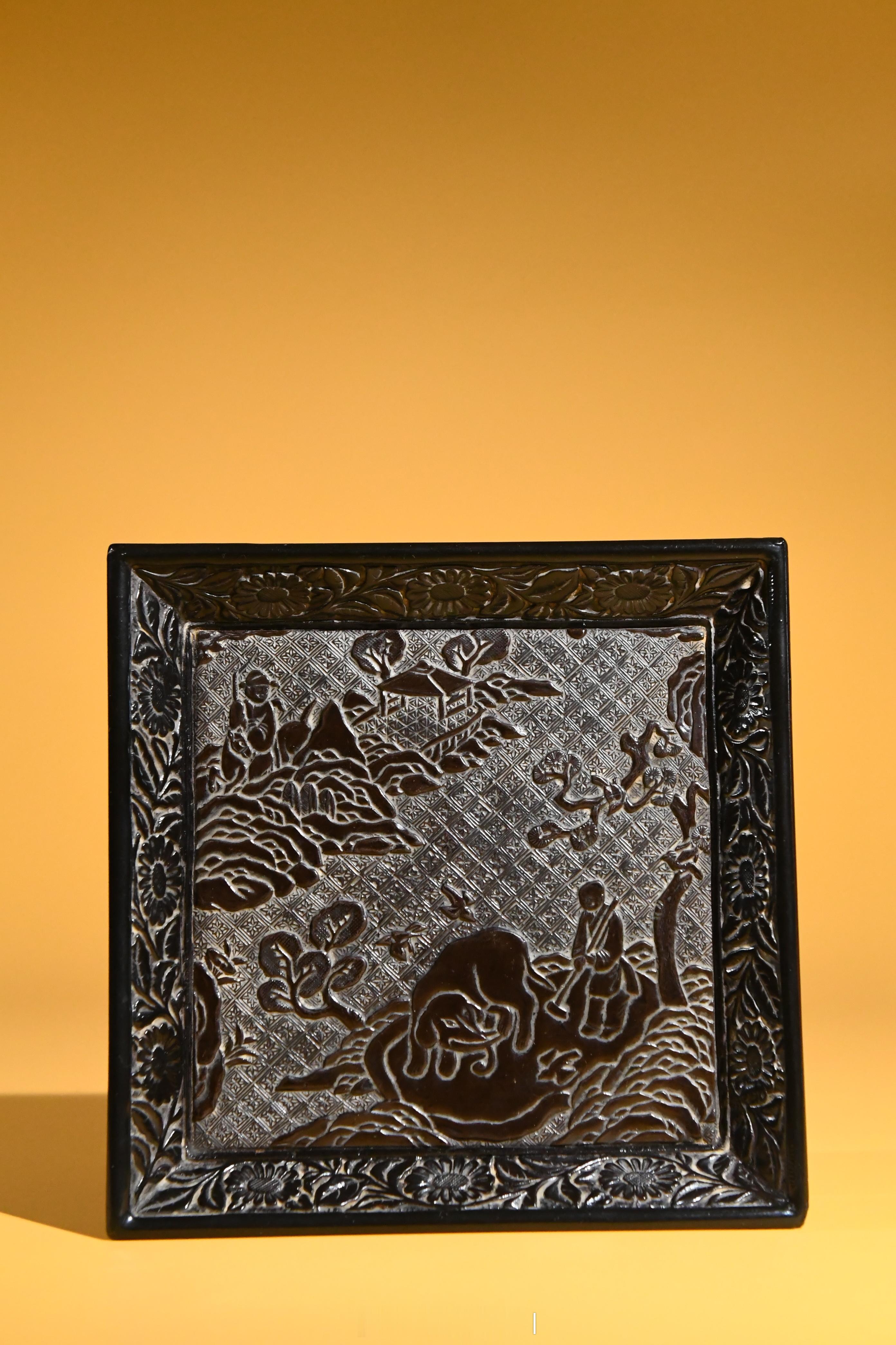 器以木为胎经琢制髹漆剔刻而成,方体,浅身,斜壁,撇口,下承四方平底,内壁剔刻有人物活动画面,外壁髹饰黑漆,光素无饰。其中,盘内斜壁剔刻折枝花卉纹,四方内底中央以四方锦纹为地,剔刻一"洗象图"。画面中,一头大象侧首回望,其身后,一名童子手持长柄刷子准备为大象洗漱;远处,一名骑马官员隔山观望。山形远遁,近树参差,画面纵深意远。在我国佛教传说中,大象是普贤菩萨的坐骑,也是圣洁的化身,加之民间极为少见,一直被视为祥瑞。明清时期,皇宫中例于三伏日为畜养的大象洗浴,届时往往河两岸观者万众,极为热闹。此件方盘正是基于这样的社会背景精制而成,反映了明代临河洗象的场景。甚为少见。