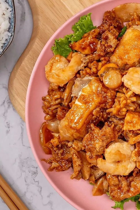 八珍的配料可以自由发挥,天津人的日子可以随遇而安,不较劲,才够味儿。八珍的灵活,是基于食材本味的通透,虾仁的鲜、鱿鱼的醇,少一样都失了魂。大火收汁、薄芡挂汁,端上桌油光锃亮,夹起来不滴答,裹着每块豆腐都够味。