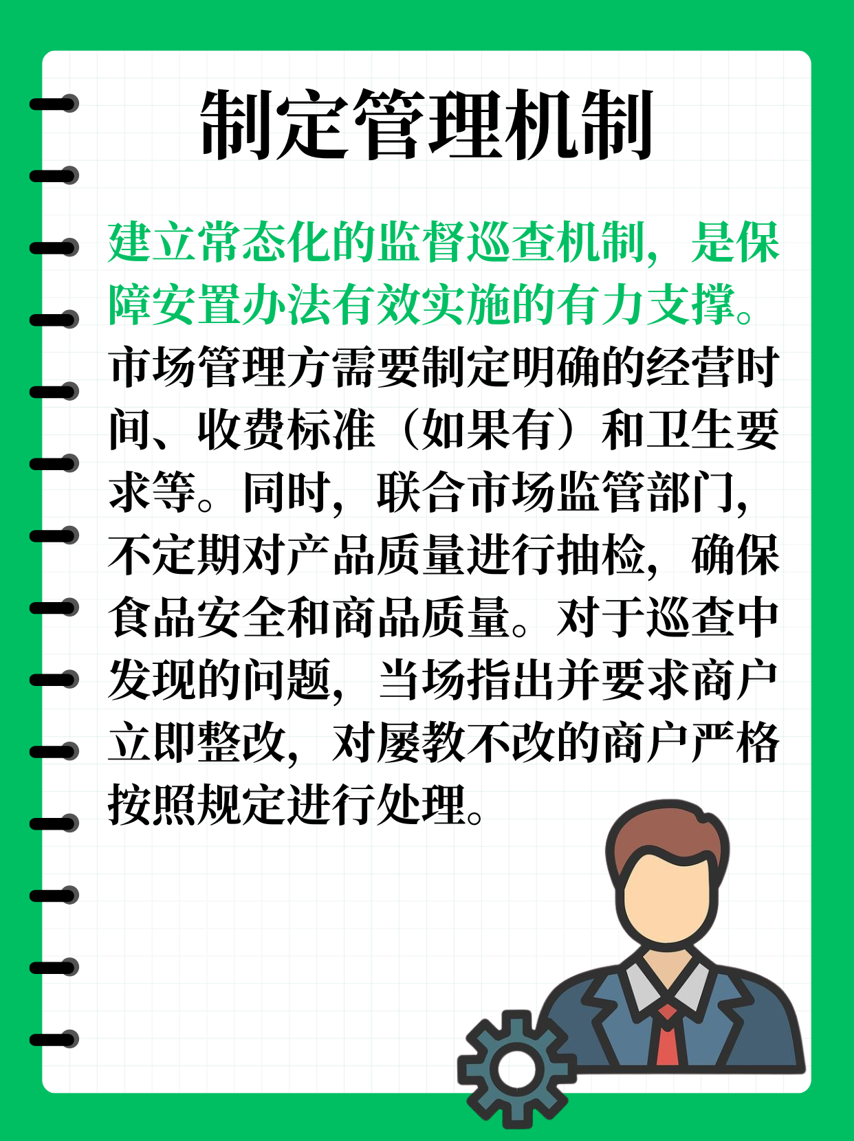 一、合理规划安置区域 二、完善基础配套设施 三、制定管理机制 四、严格商户登记审核