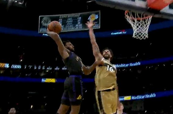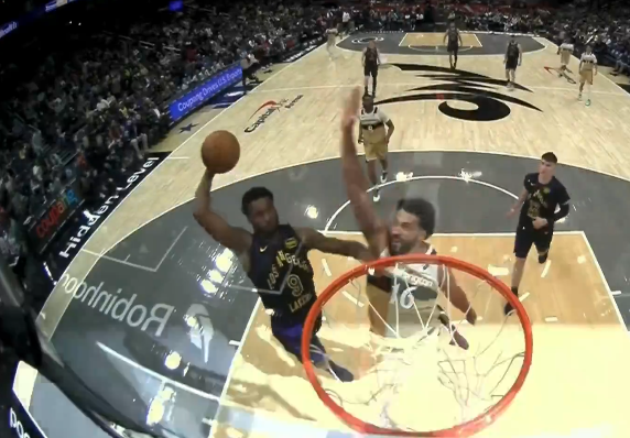 布朗尼快攻起飞试图战斧隔扣,被吉尔身后大帽拦截