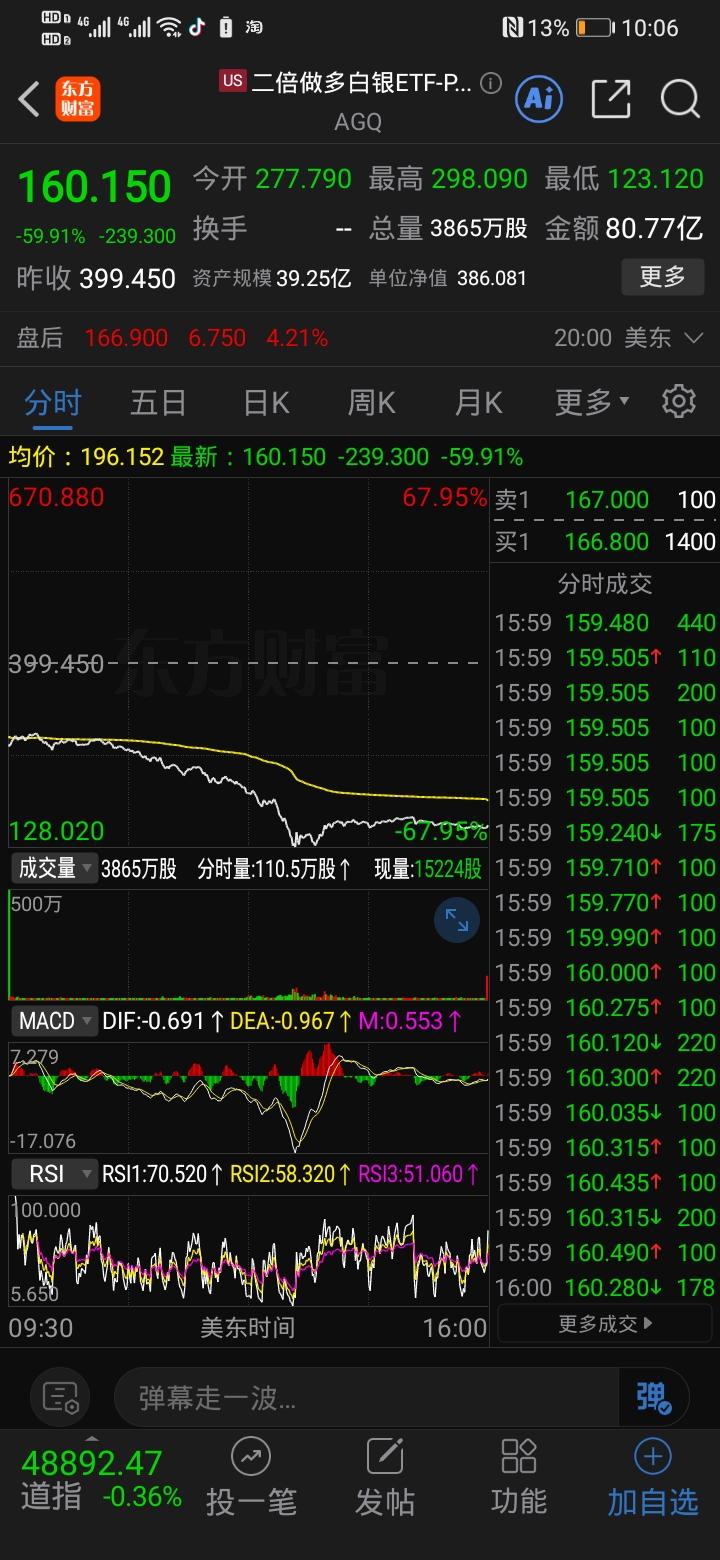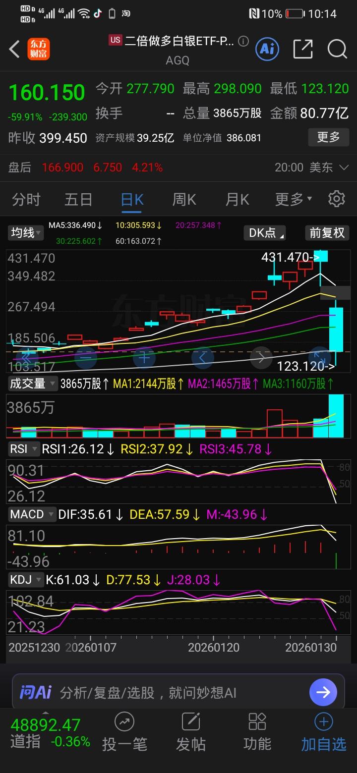投资警示:ETF不是避风港,牛市更易埋雷💥 今天看到一个触目惊心的案例:二倍做多白银的杠杆ETF(AGQ)单日暴跌59%,直接腰斩! 这个产品,给所有投资者敲响了警钟: 🔴 ETF不是无风险躺赢 - 带杠杆的ETF风险极高,涨跌同源,涨得有多猛,跌得就有多惨。 - 这类产品设计初衷是给短线交易者用的,长期持有必然被波动损耗吞噬本金。 - 即使是普通ETF,也会跟踪指数下跌,不存在绝对安全的投资品。 🟠 牛市,才是散户亏钱的重灾区 很多人以为熊市才可怕,其实牛市才是亏损的主要来源: - 牛市后期,情绪亢奋,成交量放大,大量投资者在高位接盘。 - 一旦牛市结束或出现中期调整,这些在后期追高买入的人,往往亏得最狠。 - 赚钱效应让人盲目自信,加杠杆、追热点、频繁交易,最终把利润还给市场。 🟡 永恒的铁律:任何时候都不要追高 无论牛熊,追高都是投资的大忌。 - 这次白银、黄金的暴跌,导火索是市场预期美联储未来降息可能趋缓。 - 受此影响,下周A股的有色板块大概率会面临短线冲击。 - 这再次印证了:追高买入,很可能买在情绪最高点,一旦风向反转,就是深套。 投资的本质是认知的变现,我们赚的是自己看得懂的钱。共勉! ETF指数 ETF市场分析 ETF投资 股票ETF etf板块 ETF 指数型etf 黄金