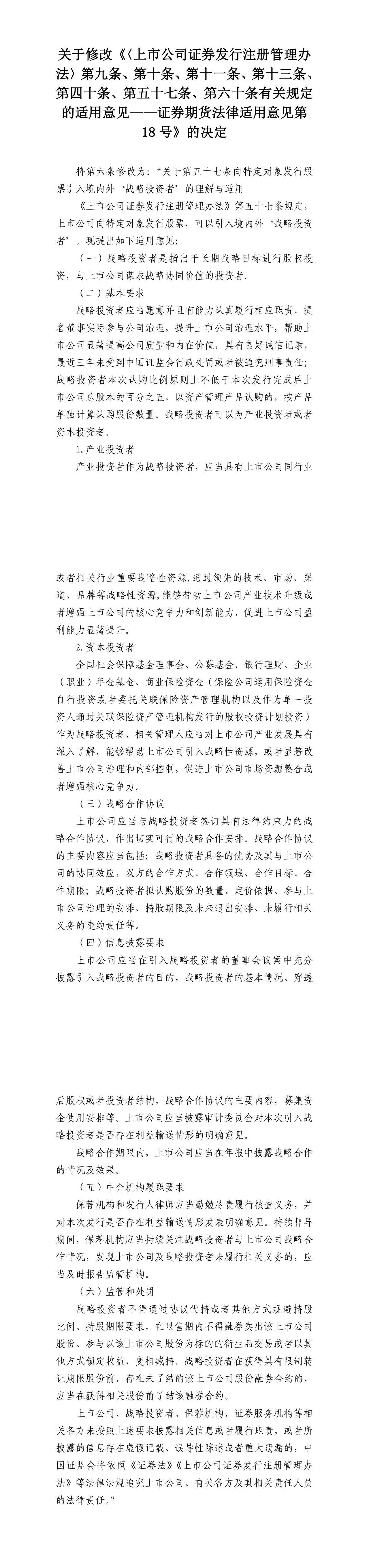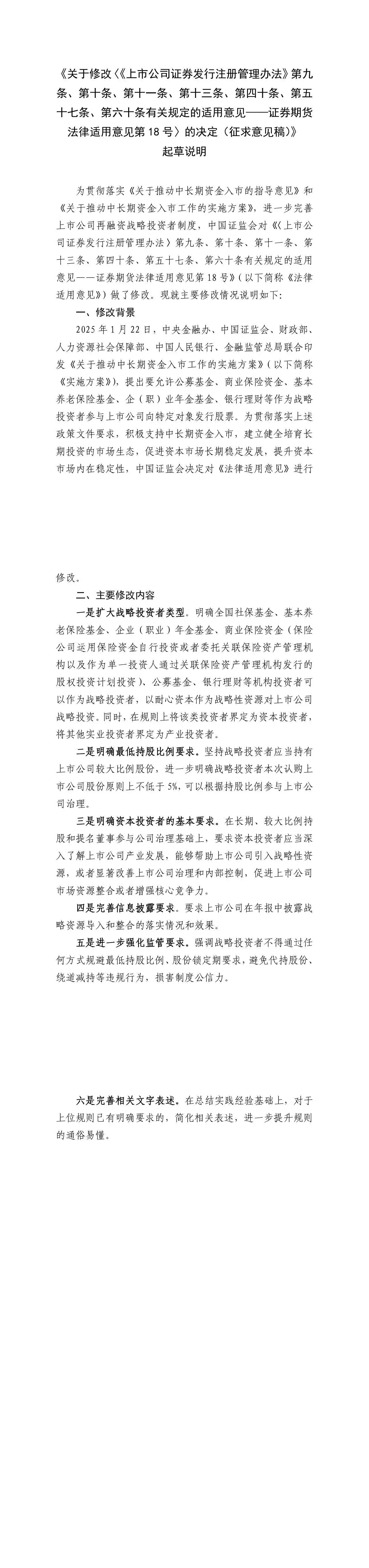 为贯彻落实《关于推动中长期资金入市的指导意见》和《关于推动中长期资金入市工作的实施方案》,进一步完善上市公司再融资战略投资者制度,中国证监会对《〈上市公司证券发行注册管理办法〉第九条、第十条、第十一条、第十三条、第四十条、第五十七条、第六十条有关规定的适用意见——证券期货法律适用意见第18号》进行修改完善,形成了《关于修改〈《上市公司证券发行注册管理办法》第九条、第十条、第十一条、第十三条、第四十条、第五十七条、第六十条有关规定的适用意见——证券期货法律适用意见第18号〉的决定(征求意见稿)》(以下简称《关于修改〈证券期货法律适用意见第18号〉的决定(征求意见稿)》),现向社会公开征求意见。公众可以通过以下途径和方式提出反馈意见: