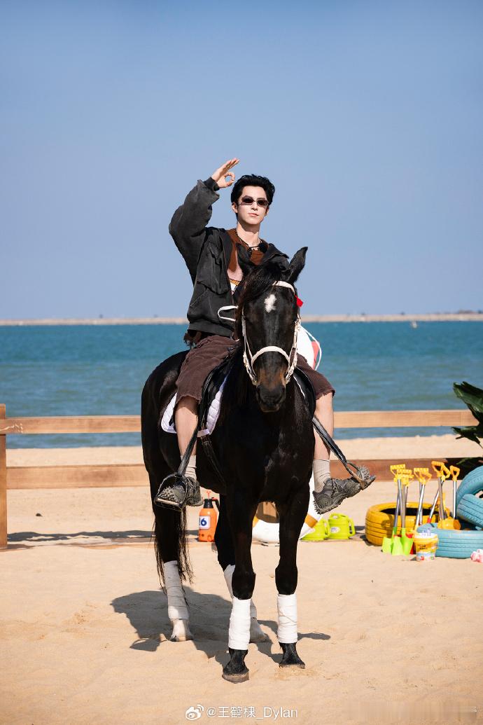 王鹤棣比嘘王鹤棣优雅骏马看到王鹤棣全黑造型海边策马,黑衣配黑马,氛围感和气场都很到位