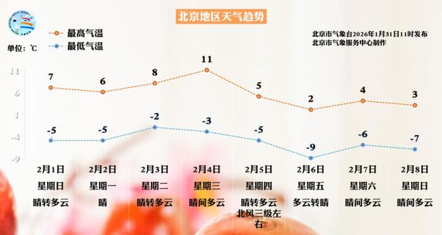 2月1日白天:晴转多云;偏北风2、3级;平原地区最高气温7℃,山区最高气温3~7℃;最小相对湿度20%。