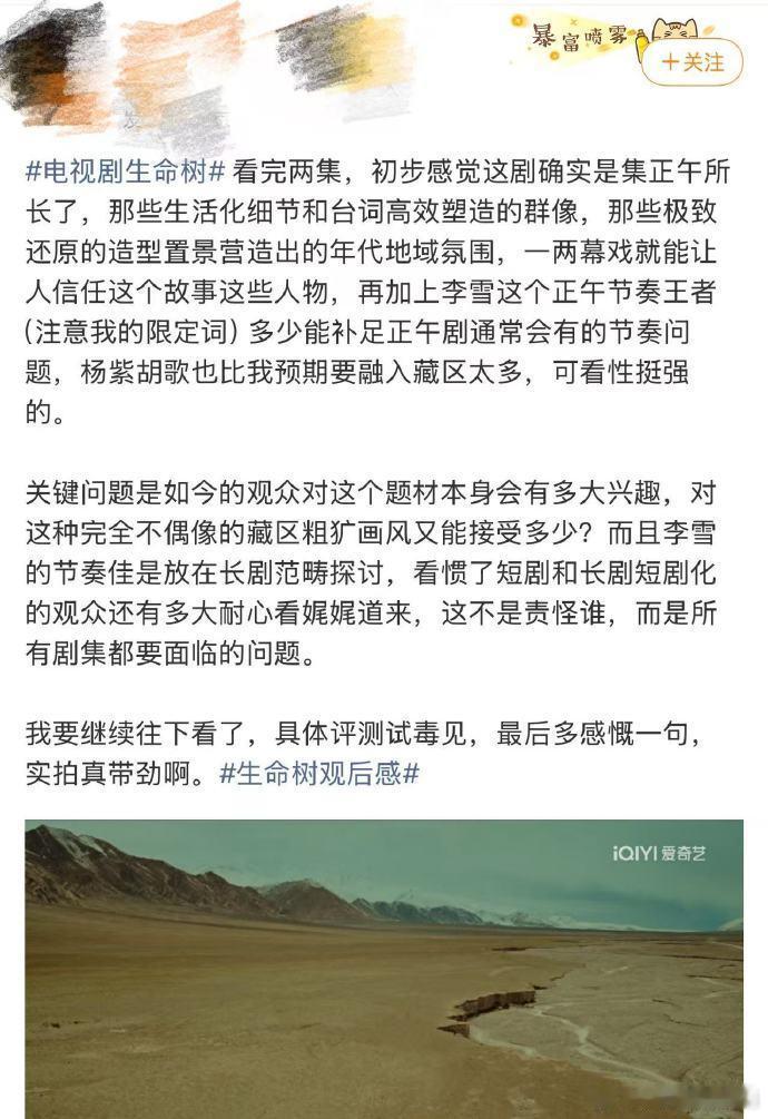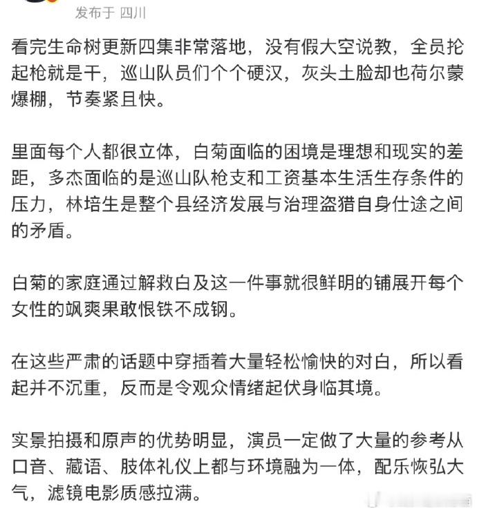 生命树真实评价谁看《生命树》不夸一句良心好剧!实景拍摄配原声台词,沉浸感直接拉满,画面和高原环境融在一起,每一帧都有纪录片的质感,制作诚意真的拉满了!