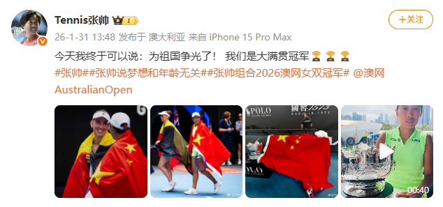【#张帅发文回应澳网夺冠#】#张帅说终于为祖国争光了# 1月31日,在2026澳大利亚网球公开赛女双决赛中,37岁的中国球员搭档比利时球员梅尔滕斯在首盘1-4落后的逆境下顽强追击,最终以2-0战胜7号种子达尼丽娜/克鲁尼奇,夺得冠军!这是张帅在2019年搭档斯托瑟夺冠后再次收获澳网女双冠军。赛后,张帅发文:今天我终于可以说:为祖国争光了! 我们是大满贯冠军🏆🏆🏆 #张帅回应澳网夺冠# #张帅说我们是大满贯冠军# #张帅说为祖国争光了#