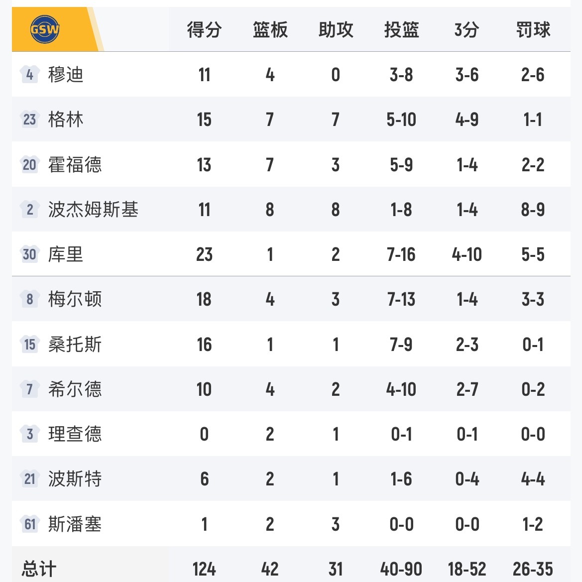 脸都不要了!勇士124-129惜败活塞,看看本场比赛的数据和正负值,谁为球队失利