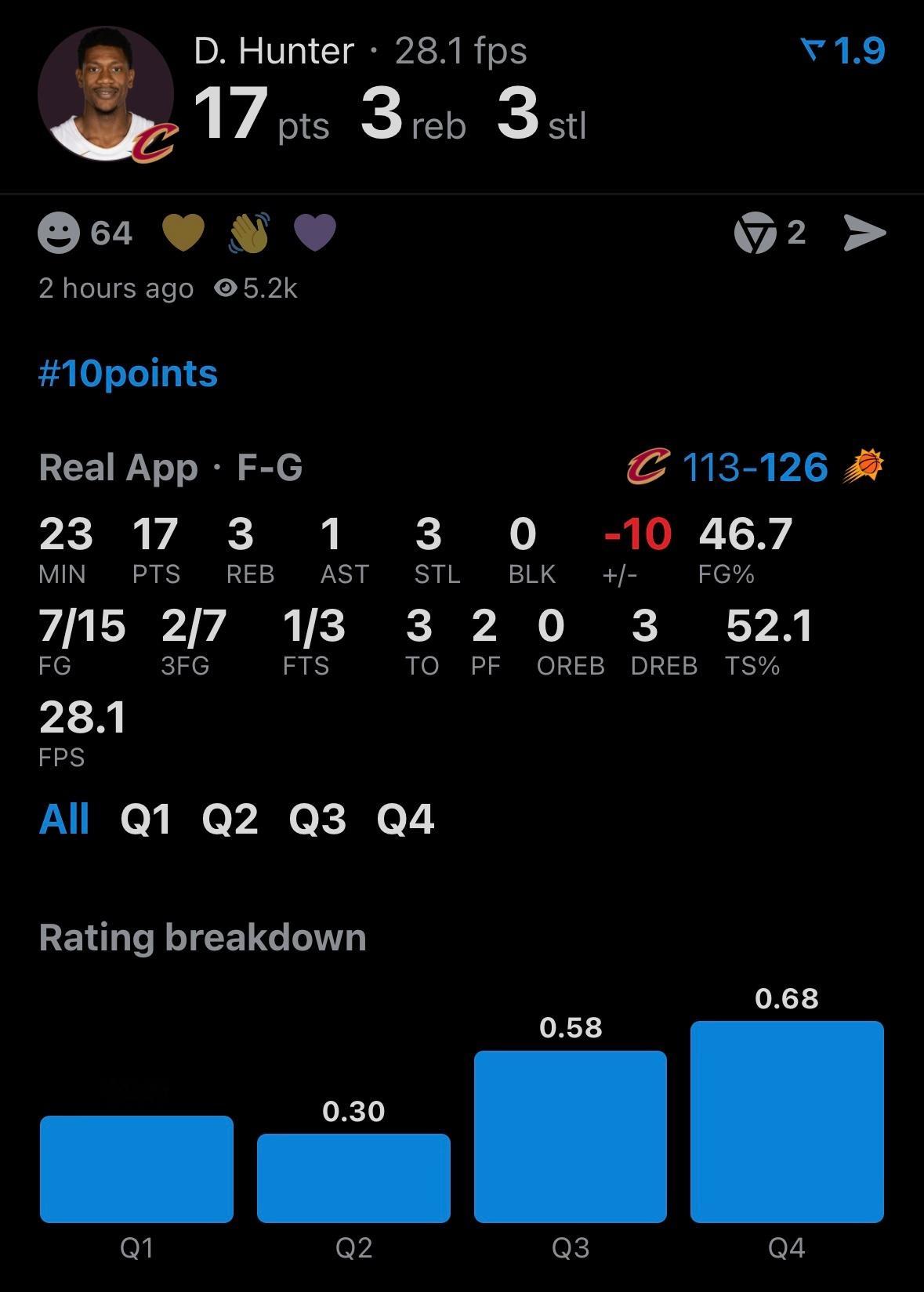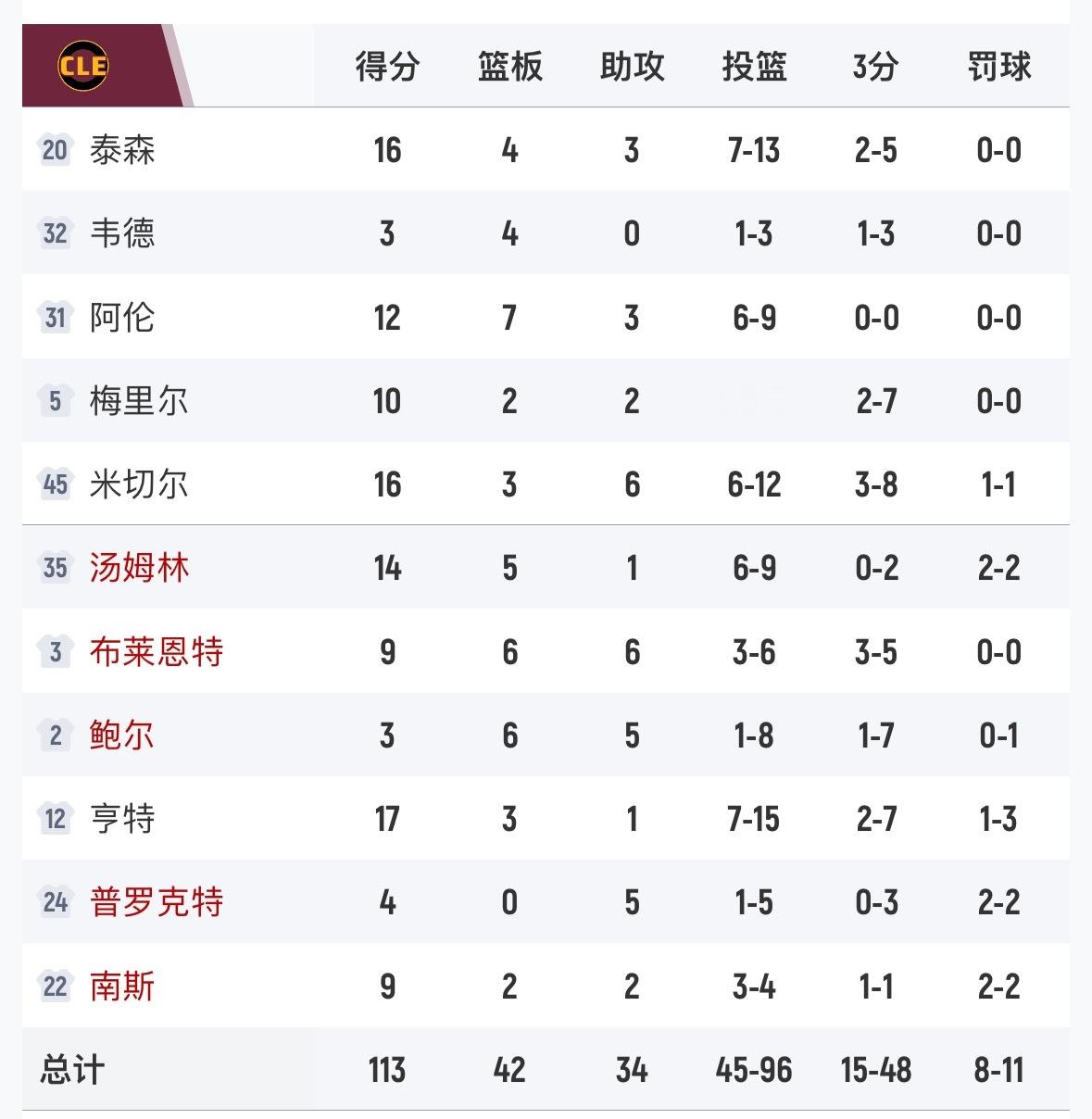 骑士客场不敌太阳,亨特17分3板3抢断3失误,投篮15投7中,三分7中2。