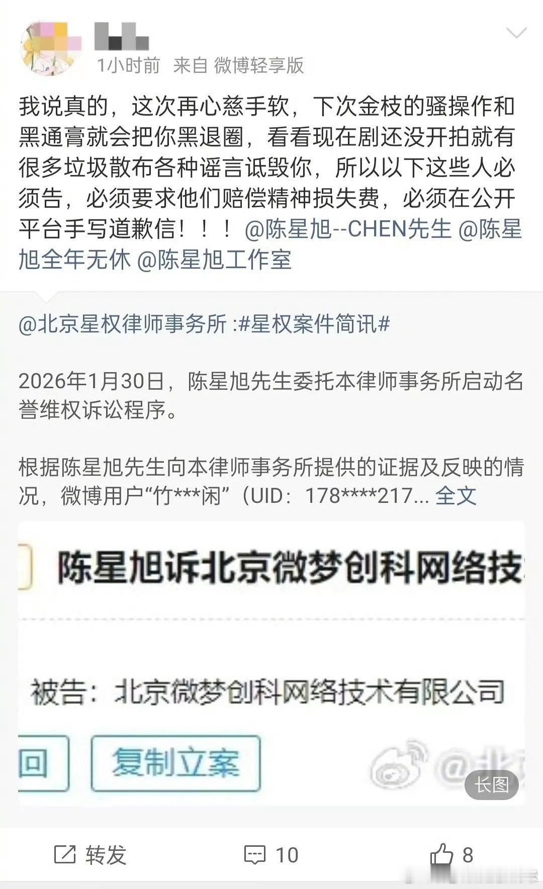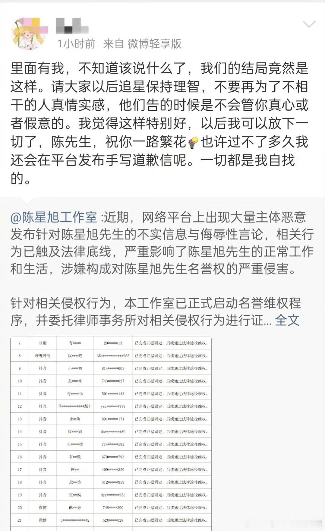 陈星旭告粉丝网友发帖自称是陈星旭的粉丝,上一秒还在开心陈星旭方告黑!!下一秒,自己喜提上榜