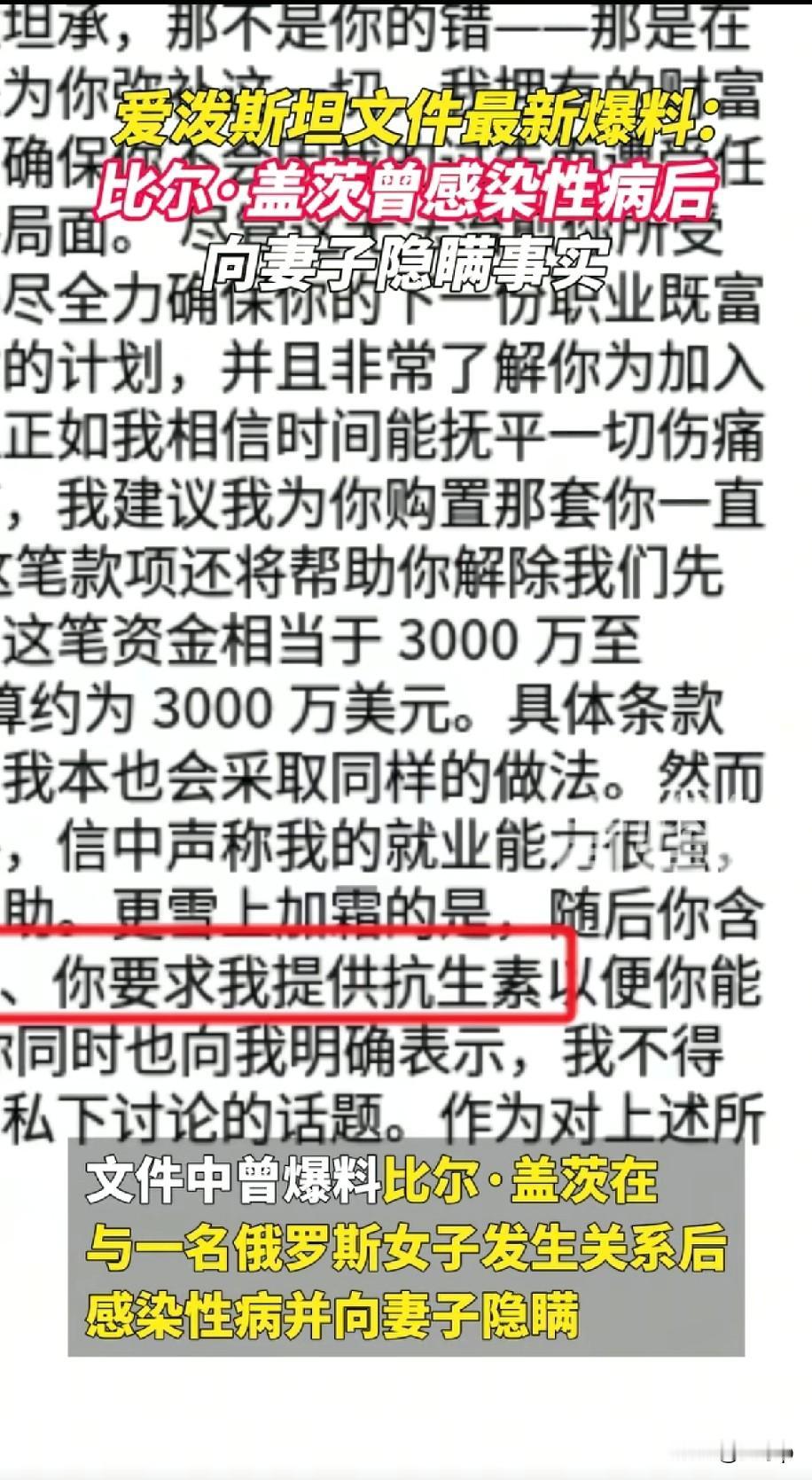 美国的爱泼斯坦案 竟然把盖茨也卷了进去,昨天美国司法部公布了长达300万页,最新版的爱泼斯坦文件,其中就爆料了比尔盖茨 曾经和一名俄罗斯女子发生关系后感染性病,并向妻子隐瞒,盖茨方面回应,不属实! 爱泼斯坦是美国的一名亿万富翁,从2005年到2019年,两次因为组织性交易被捕,2019年8月在狱中死亡,去年7月份调查结果出来说是自杀 爱泼斯坦跟美国政界的多位人物的关系都很微妙 如今71岁的比尔盖茨,也是世界上最大的慈善家没想到也会出这样的事。 信息来源——《青蜂侠》