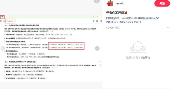 还有网友反映,向几个同类模型询问同样的税务问题,只有元宝会给出错误的计算答案。