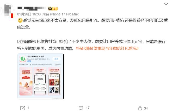 有博主表示,发放红包的活动只是引流,元宝想要用户留存还是得看好不好用和后续运营。