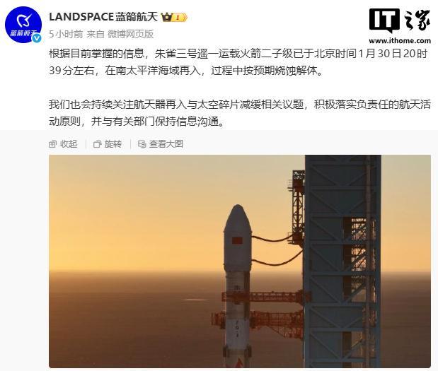 IT之家1月31日消息,蓝箭航天今日发文称,根据目前掌握的信息,朱雀三号遥一运载火箭二子级已于北京时间1月30日20时39分左右,在南太平洋海域再入,过程中按预期烧蚀解体。