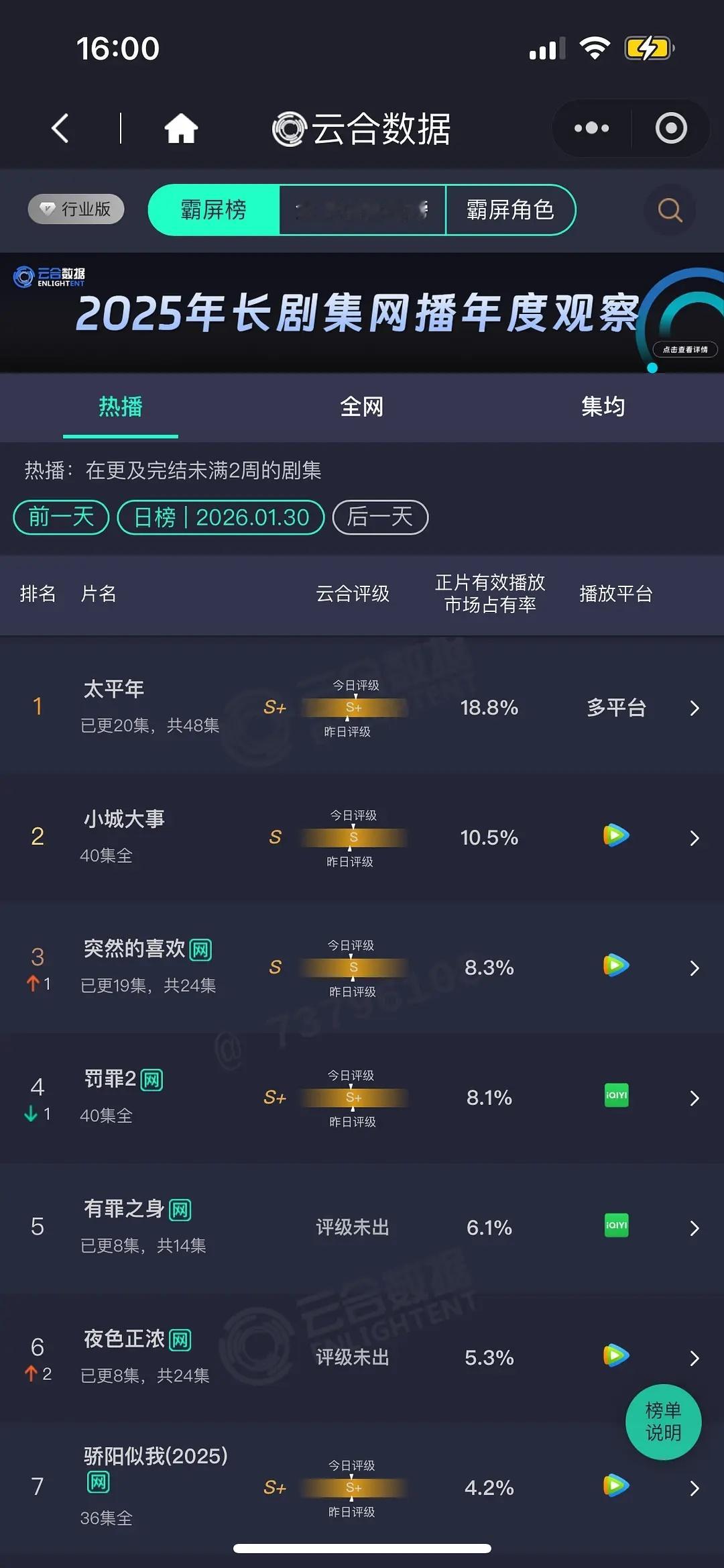 大盘1.7+太平年 18.8% 3200+ 倒是每天都在涨有罪之身 第三天 6.1% 1000+ 扑抬走夜色正浓 第三天 5.3% 900+ 扑抬走暗恋者的救赎 快播完了才600+ 无人在意的扑生命树 首日3.5% 600+ 一般般,就看这两天了