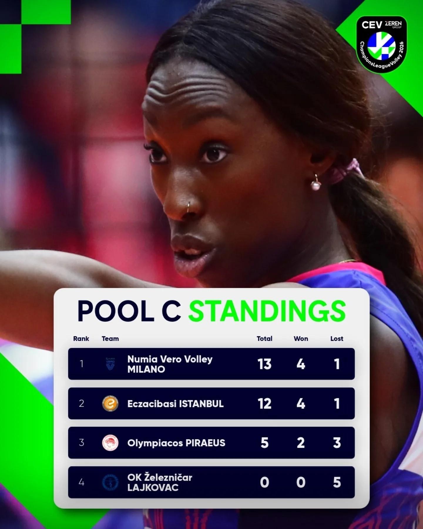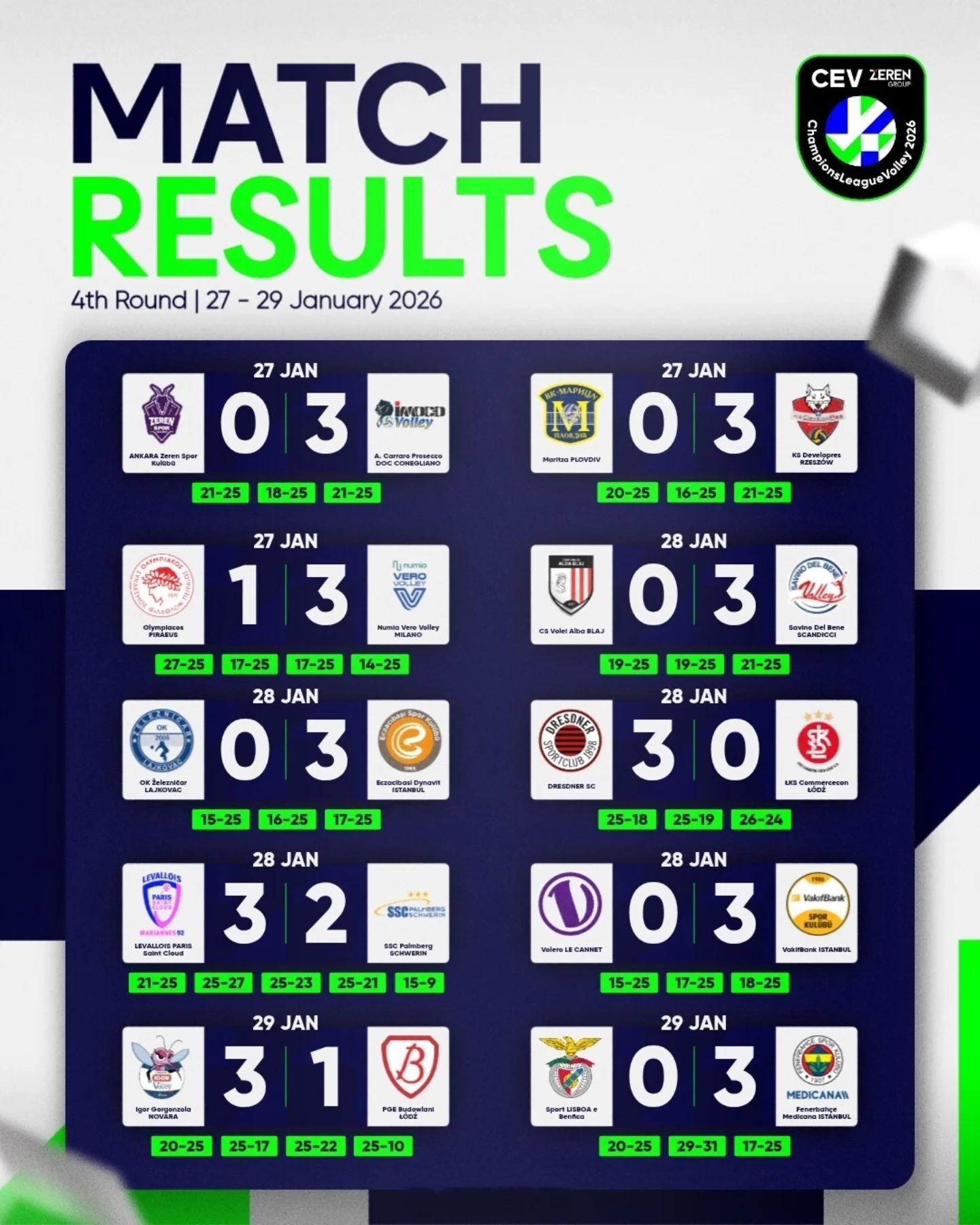 2026女排欧冠 正赛小组赛第5轮比赛结果,及此轮过后5个小组的积分排名。费内巴切和科内利亚诺已经提前一轮确定晋级八强。