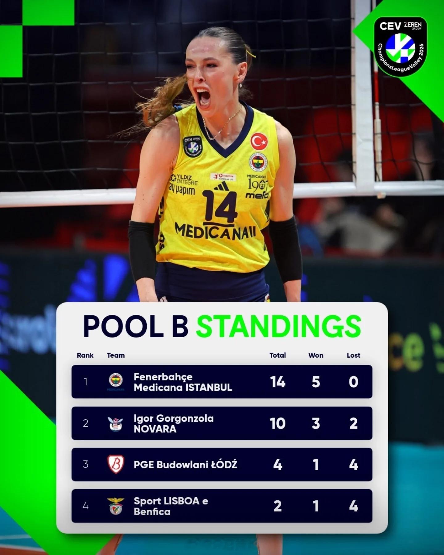 2026女排欧冠 正赛小组赛第5轮比赛结果,及此轮过后5个小组的积分排名。费内巴