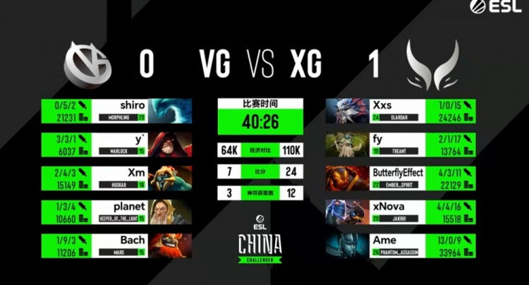 [26分钟]VG先开打肉山,双方第一波交出多个大招,NTS火猫先吃伤害阵亡,VG双大哥想追但是三核全被xNova杰奇洛冰住了!Ame的PA爆发伤害直接秒掉了shiro水人+Bach马尔斯,Xm哈斯卡也被留住!这波XG击杀对手三大哥!Ame的PA三杀!XG成功拿下二代肉山,Ame的PA带盾!双方经济差瞬间来到12K!