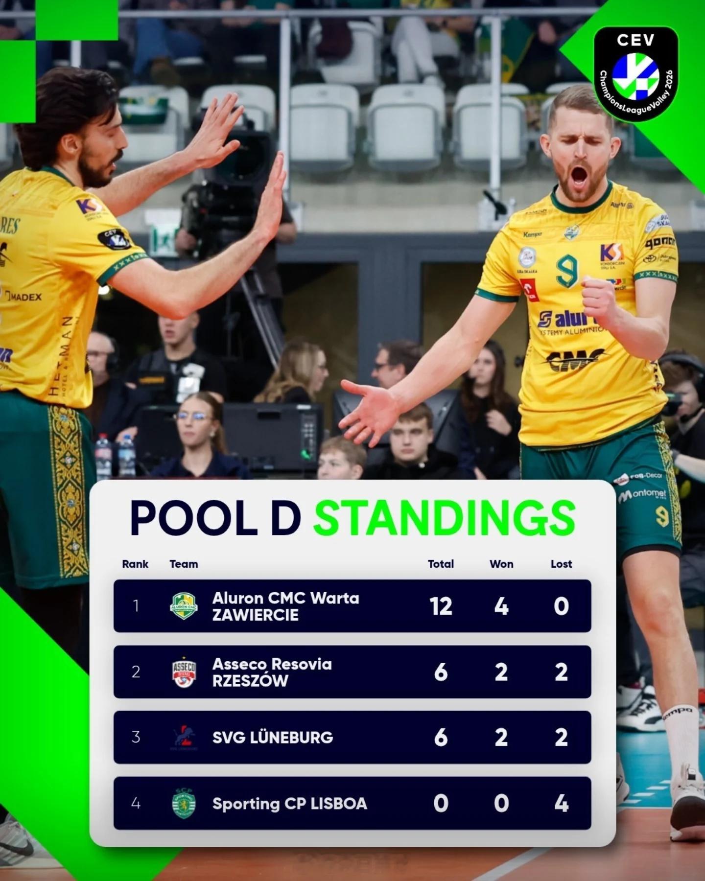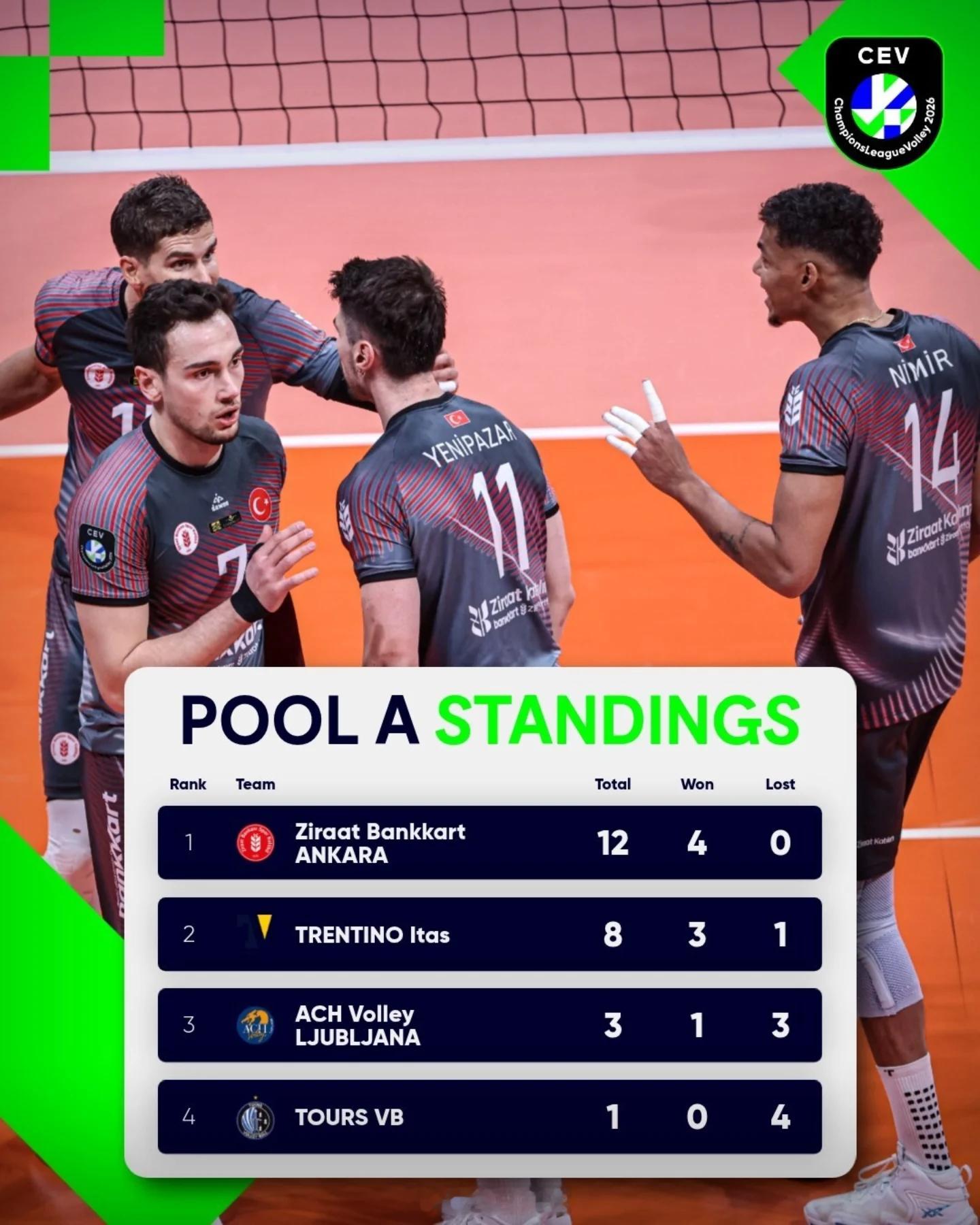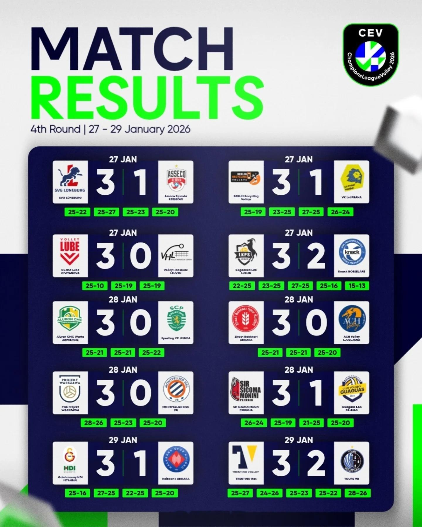 2026男排欧冠 正赛小组赛第4轮比赛结果,及此轮过后5个小组赛的积分排名。