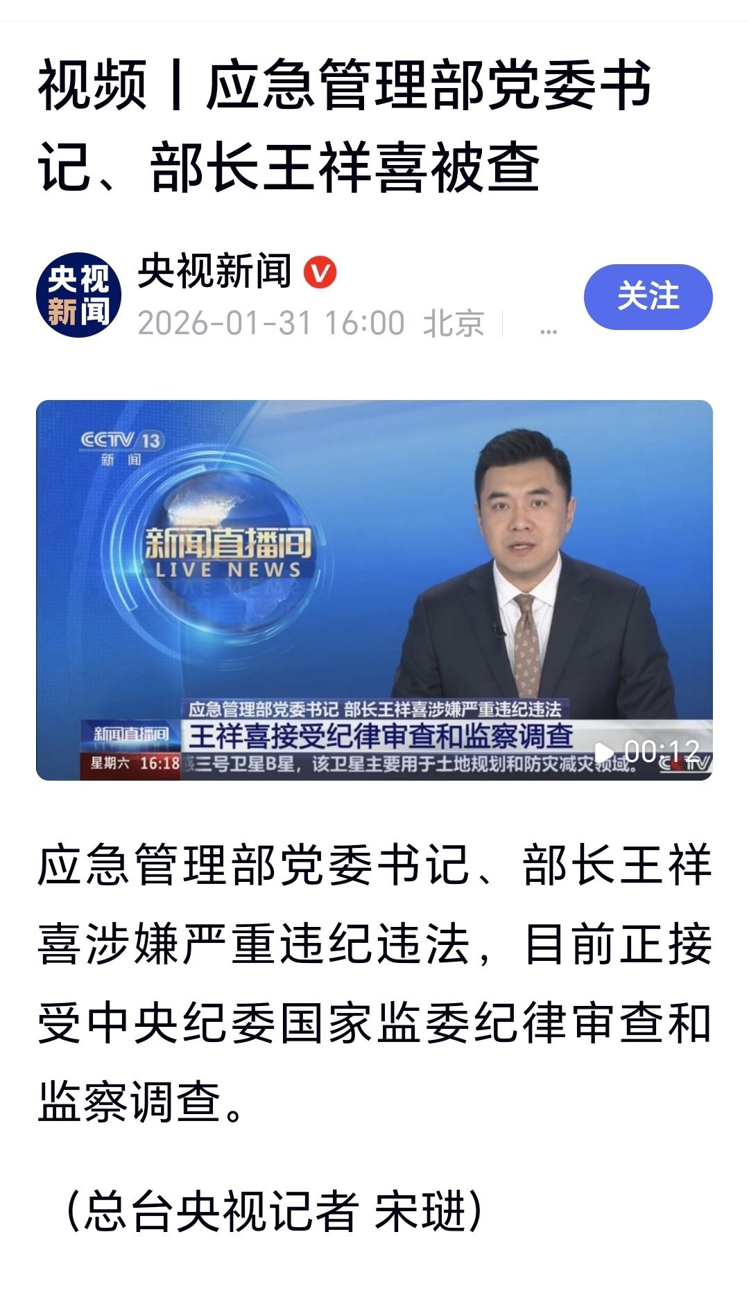 突发:应急管理部党委书记、部长王祥喜被查 开年以后重拳出击,国家打虎不断,前段时间拿下了军中的大老虎,现在又拿下了应急管理局的大老虎,坚决支持国家的持续反腐,坚决支持国家的高压反腐,让腐败分子无立足之地,让腐败分子无地自容。 很快就要春节,家家户户都在过年之前打扫除,国家也在过年之前大扫除,把这些腐败分子揪出来,让全国人民过一个开开心心的大年,把这些腐败分子揪出来,让全国人民过一个安安心心的大年。 这些腐败分子就是在破坏我们百年未有之大变局,这些腐败分子就是在破坏我们经济发展大好局面,这些腐败分子就是在与全国人民作对,全国人民绝不答应允许这些人的存在,把这些人揪出来,越快越好,把这些人揪出来,越多越好。 坚决支持祖国的决定,对贪腐分子严惩不贷,继续推动全面从严治党,将反腐工作进行到底。 中国加油,中国必胜!祝愿我们伟大的祖国繁荣富强,祝福中华民族早日实现伟大复兴!
