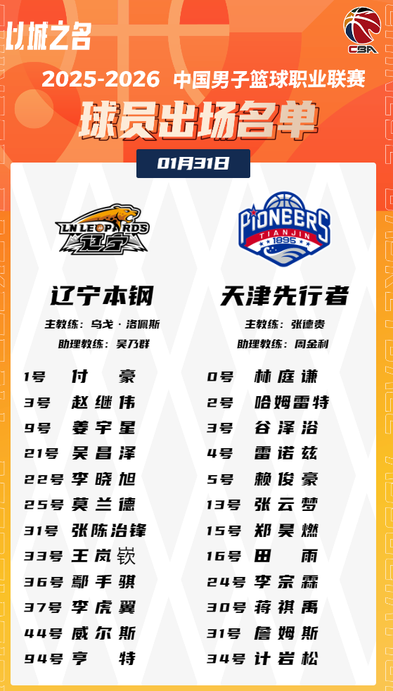 虎扑01月31日讯今晚CBA常规赛,辽宁对阵天津的大名单已经出炉。