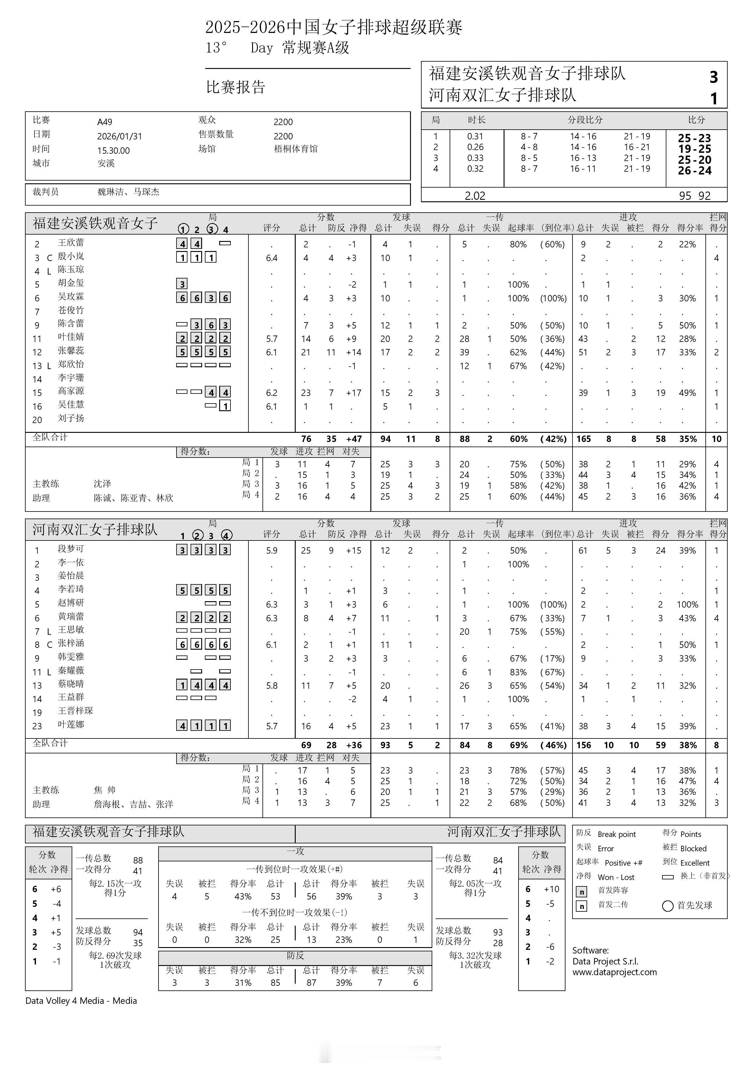【中国女排超级联赛 福建3-1河南】31日下午,A级常规赛第13轮,福建安溪铁观音在主场以3-1(25-23, 19-25, 25-20, 26-24)力克河南双汇,收获第三场胜利。高家源23分,张馨蕊21分,叶佳婧14分,陈含蕾7分;段梦可25分,叶莲娜16分,蔡晓晴11分,黄瑞蕾8分(拦4)。