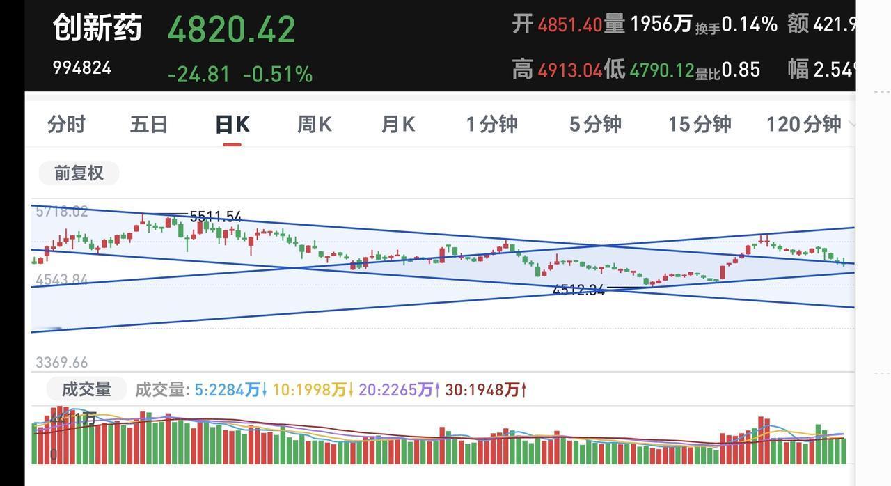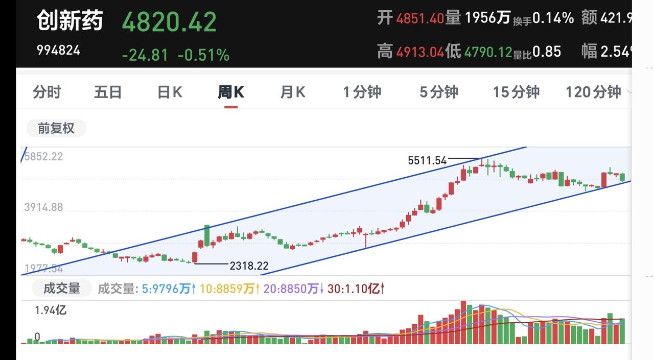 基金:创新药板块应该怎么办 持有的创新药板块基金周五逆势上涨,净值更新上涨了0.91%,这个板块下跌了1.36%,持有人数在所有板块当中排名第10位,散户人数也是不少。 这个板块周五是冲高回落,然后是低位横盘震荡至收盘,板块中上涨的基金只有6只,见下面的截图4,我持有的创新药板块基金富国上涨幅度最大。 看下面的截图5,这是创新药板块日K线图,我先画了两条倾斜向下的斜线,这是创新药板块日线级别下跌通道,前段时间上涨突破了这个下跌通道的上轨线,现在是在回踩确认中已经回踩到了下跌通道上轨线上,按照这条下跌通道来看,那一次的突破是一个假突破。 后来我又画了两条倾斜向上的斜线,这是创新药板块日线级别短期上涨通道,现在的位置距离这个上涨通道下轨线比较近,如果回落不破这个上涨通道的下轨线,短线的人是一个可以考虑的进场点。 看下面的截图6,这是创新药板块周K线图,现在的位置处于这个上涨通道中,距离上涨通道的下轨线非常近,长线持有的人可以在这里考虑要不要分批进场。 创新药板块基金我持有126217元,持有收益14828元,持有收益率13.31%,累计收益116744元,每天定投10块钱。 去年止盈了这个板块的人,现在是完全可以捞回那个时候止盈的筹码,止盈的位置与现在的位置有一段距离,是有足够的空间和利润的,捞回止盈的筹码以后,你不要管它是上涨还是下跌,你只要看一下你有没有把差价做出来,如果做出了足够的差价,你管它后面是上涨还是下跌。 许多人想在最高点出来,很多人想在最低点进场,这些都是不切实际的想法,偶尔也有可能让你碰上运气,但我们玩基金不是靠的运气,我们靠的是耐心和平常的心态。 花一秒钟点赞,花30秒钟评论就是对我最大的支持,谢谢大家的支持。