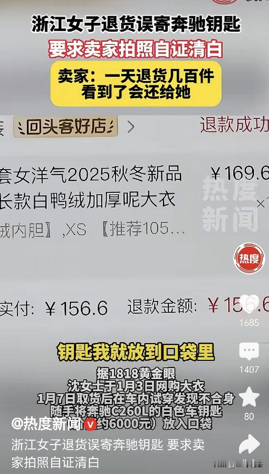 “离大谱了!”浙江嘉兴,一女子花156元网购大衣,收快递时直接就穿上了,可她发现大衣不合适,她要退货,又发现外面太冷,她穿回家里,第二天让快递员上门来取,谁知她开车回家时,把奔驰车钥匙放进兜里,第二天衣服寄走,等她要用车时,找不到钥匙,她这才想起来钥匙还在大衣兜里,她要求商家把钥匙寄回,可商家说退货几百件,如果看到了会寄回来,女子急了: 配一把钥匙6000元,你没开箱视频,没入库视频,怎么能证明你的清白? 沈女士想买大衣,经过一番对比,她花156元拍了一件呢子大衣。 她在家里焦急的等待,她等了三天,终于显示包裹被送到了快递驿站。 她开车回家,刚好顺路去拿,她在驿站拆了包裹,因为寒冷,她当场就把大衣穿上。 她从驿站出来,坐进了自己的奔驰C260L车里,她一溜烟开到自己家楼下,出来时仍然穿着那件大衣。 其实她试穿时就感觉衣服不太合适,可是因为实在太冷,她决定穿回家再说,第二天再退货,让快递员小哥上门取走就是。 谁知她坐在车上,启动了车辆,车辆开进了小区,她下车后就往家里走去。 她一手拿着钥匙,一手拿着手机,她随手就把钥匙手机放进了大衣兜里。 她走进家门,只记得把手机取出,可是她却忘记,那把奔驰车钥匙却被她忘记在了大衣兜里。 她浑然不觉,第二天快递小哥上门取件,沈女士把衣服装好,直接就递到了小哥手里。 等她要用车,突然发现,找不见奔驰车钥匙,她思来想去,突然想起来自己把钥匙忘记在了大衣兜里! 她心里发慌,赶紧给商家发去了消息,说自己不小心把车钥匙忘记在退货的大衣兜里。 她要求商家把钥匙给她寄回来,可商家表示,说仓库是临时阿姨在收货,他们每天都要处理上百件退货。 虽然那些阿姨在检查退货时也会摸一下衣服口袋,但是因为衣服太多,如果要是遗漏,那也是所难免的。 沈女士急了,她这一把钥匙,配一把需要6000多块,明明商家可以帮她找回,为何却用这话来唐塞自己? 她质问商家,你说没有就没有了?空口无凭,你需要证明自己!你拿不出来开箱视频!你也拿不出来入库视频,你拿不出证据来证明自己! 不过,沈女士倒是承认,自己在这件事中也有责任,毕竟是她犯错在先,是她自己先把钥匙搁在了大衣兜里。 可是尽管如此,她还是觉得商家对自己敷衍了事,你帮我找一找能咋,找个钥匙能费啥事? 可是她不知道,商家每天处理的退货很多很多,每天都有上百件的退单要等着收拾。 那些阿姨都是商家临时请来的工人,她们负责把退回来的衣物再重新整理。 仓库没有安装摄像监控,阿姨们整理衣物时也会顺便掏一掏兜。 有时候确实能掏出来纸巾杂物,在不影响二次销售的情况下阿姨会整理好衣物,如果有人拍下,她们就会再次发走。 商家向沈女士表示,并不是不愿意给她寄回来钥匙,如果一旦发现,肯定会给她寄回,因为这钥匙商家留着也没用。 可沈女士当场没有退货,而是在穿回家后第二天才退的。 那么她到底把钥匙有没有放进兜里,或者是放在哪个地方是她自己忘了,都有可能。 可是事到如今,谁都说不清了。 商家也表示,一旦发现钥匙就给她寄回来,也会关注近期客户的反馈。 平台也给出回应,会帮忙做进一步的协调,但是目前为止,这把钥匙还没找到。 对于沈女士要求商家自证清白,各位网友有了不同的看法。 有人认为,卖方应该反问这位沈女士,你先拿出放了钥匙的视频证据,且要一镜到底,直到打包交给快递了,然后快递要一镜到底从收到运输,到我的手上,差一个环节我都不认帐。 也有人说,我要是卖家的话,就算有我也说没有,衣服放了车钥匙,九成都是穿过后再退货的,这种人就应该惩罚她。 更有人说,沈女士这啥逻辑?你没有放钥匙的视频却要求人家拿出钥匙的视频?你要是说衣服里面有十万块钱,那商家就得马上破产啦? 其实沈女士这事儿,是沈女士自己粗心,把钥匙搁进了原本要退货的衣服兜里。 因此她自己得负主要责任,毕竟是她没保管自己的东西。 商家每天退货量大,仓库没监控,临时阿姨检查可能遗漏,管理上也有不足之处。 但是不管咋说,毕竟是沈女士有错在先,如果她没把衣服穿回家,而是发现不合适时,直接就在驿站退货,那就根本不会有后来的事情。 因此要说负责,她自己首先要承担责任! 沈女士丢了钥匙心里着急,这都能理解,但是她要求商家自证清白,确实有些强人所难。 商家并没有义务证明自己拿没拿钥匙,而且这一路上环节多了,就连沈女士到底有没有把钥匙放进大衣兜里都难说。 因为她自己也不能证明自己把钥匙搁了进去。 商家已经表示,如果发现了钥匙,就一定会给她寄回,商家就是拿着她钥匙也没任何价值,因此来说,商家的态度还算积极。 但是尽管如此,也希望钥匙能够尽快找回来,毕竟要再配一把,需要6000元的费用,好多人辛苦一个月也拿不到这么多的工资。 对此,你怎么看?欢迎评论区留言讨论。