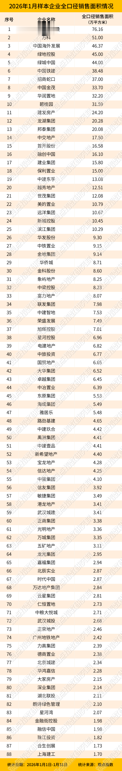 1月前10、前30、前50房企的全口径销售金额门槛值分别约为55.8亿元、14.58亿元和6.91亿元。