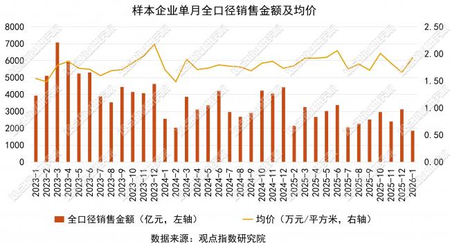 从2026年样本企业销售表现来看,2026年1月样本企业实现权益销售金额1289.91亿元,权益销售金额超过100亿元的企业有2家。全口径销售金额1851.2亿元,1月均价为1.93万元/平方米。