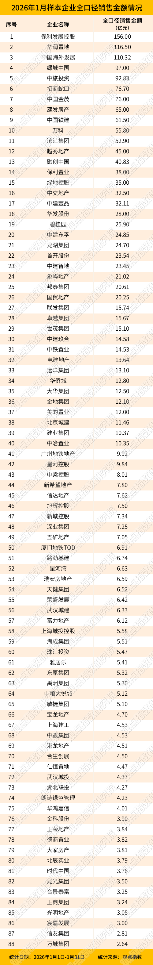 保利发展、华润置地和中海地产全口径销售金额,分别录得156亿元、116.5亿元以及110.3亿元,绿城中国和中旅投资紧随其后为97亿元、92.83亿元。