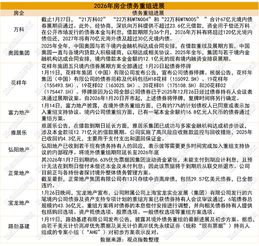 近期万科债券展期工作密集取得进展。1月21日,“21万科02”债券的展期方案通过,这是万科首笔成功完成展期的债券,涉及资金规模11亿元。1月27日晚间,万科发布公告披露,第一大股东深铁集团再次向其提供不超过23.6亿元的借款支持。