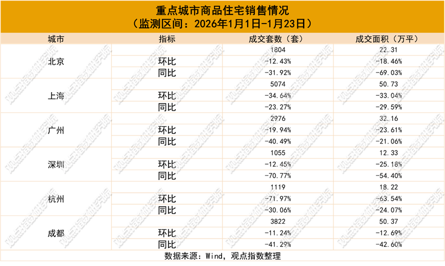 在其他重点城市中,广州1月前三周商品住宅成交面积为32.16万平方米,成交套数为2976套;二手房网签5760套,网签面积为58.46万平方米,套均面积稳定在101平方米左右,改善型特征明显。