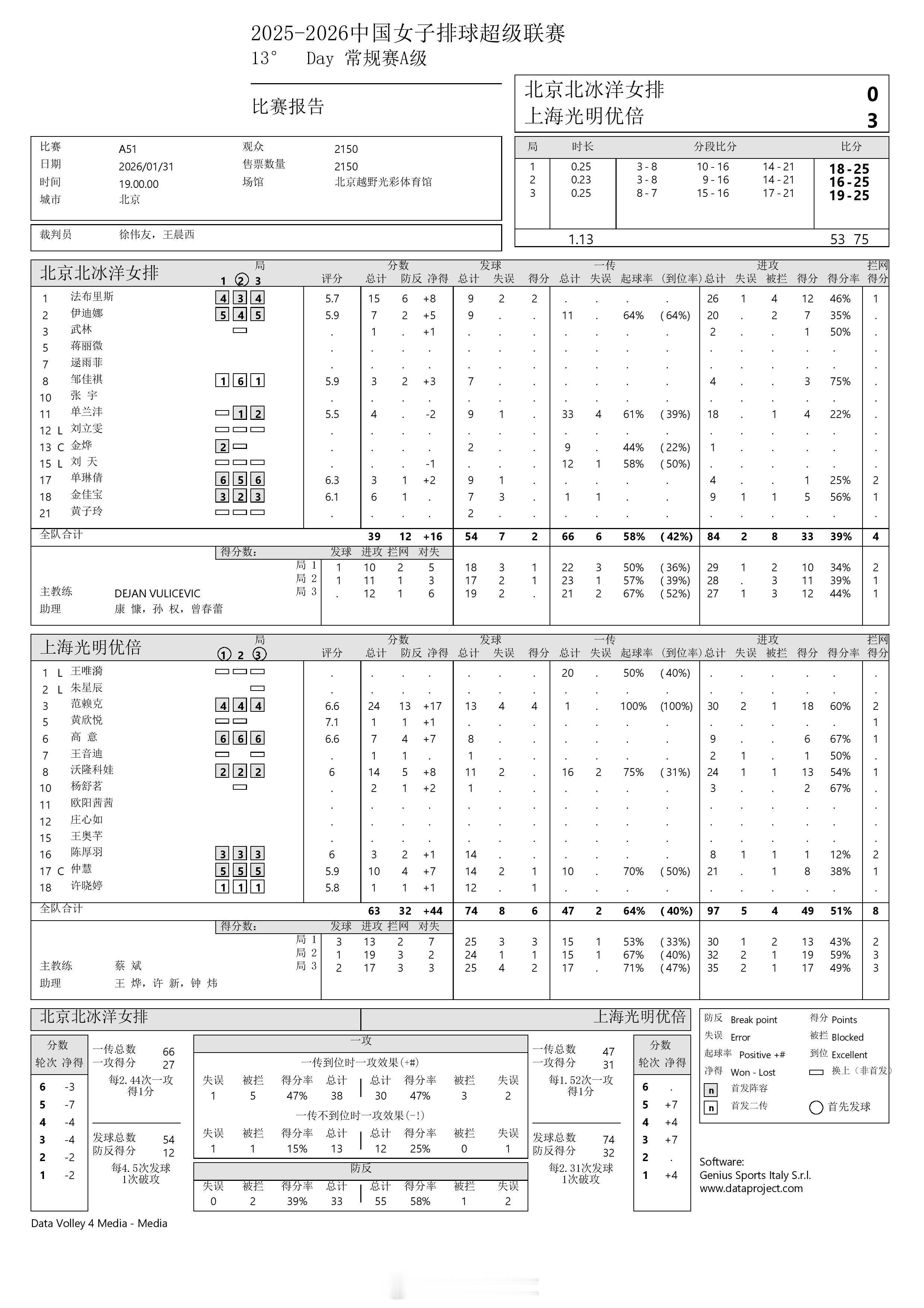 【中国女排超级联赛 北京0-3上海】31日晚,A级常规赛第13轮,北京北冰洋在主场以0-3(18-25, 16-25, 19-25)不敌上海光明优倍,遭遇第六场失利。上海女排第十二胜。法布里斯15分,伊迪娜7分,金佳宝6分;范赖克24分,沃伦科娃14分,仲慧10分,高意7分。