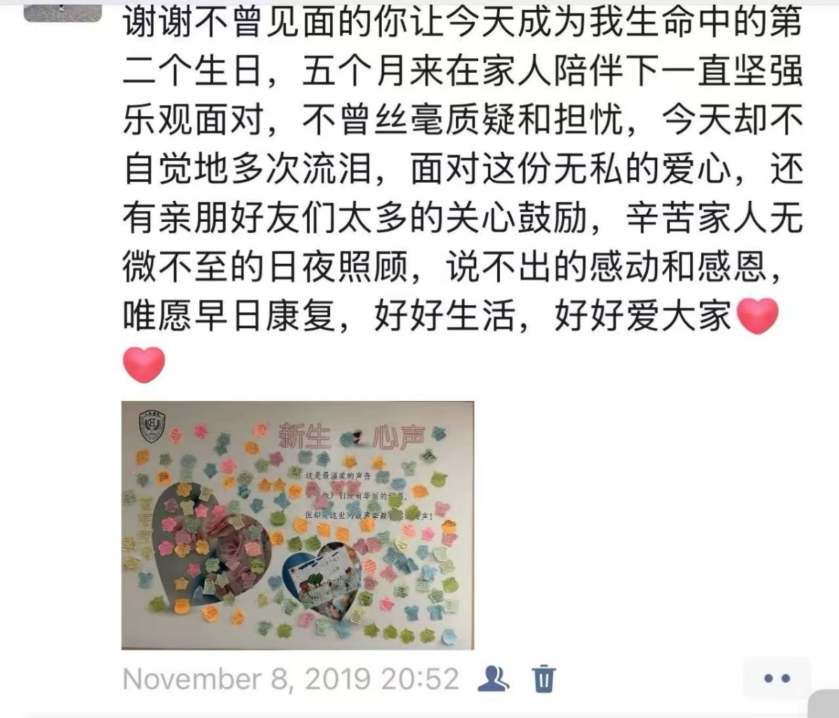 “谢谢不曾见面的你让今天成为我生命中的第二个生日……说不出的感动和感恩,唯愿早日康复,好好生活,好好爱大家”,2019年11月8日,雷女士通过朋友圈发了一张写满“新生心声”祝福的配图,以及一段肺腑之言。