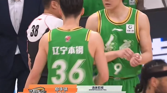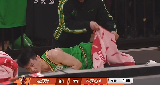 比赛第四节,鄢手骐阻挡哈姆雷特被吹违体,王岚嵚髋部受伤在场边治疗。